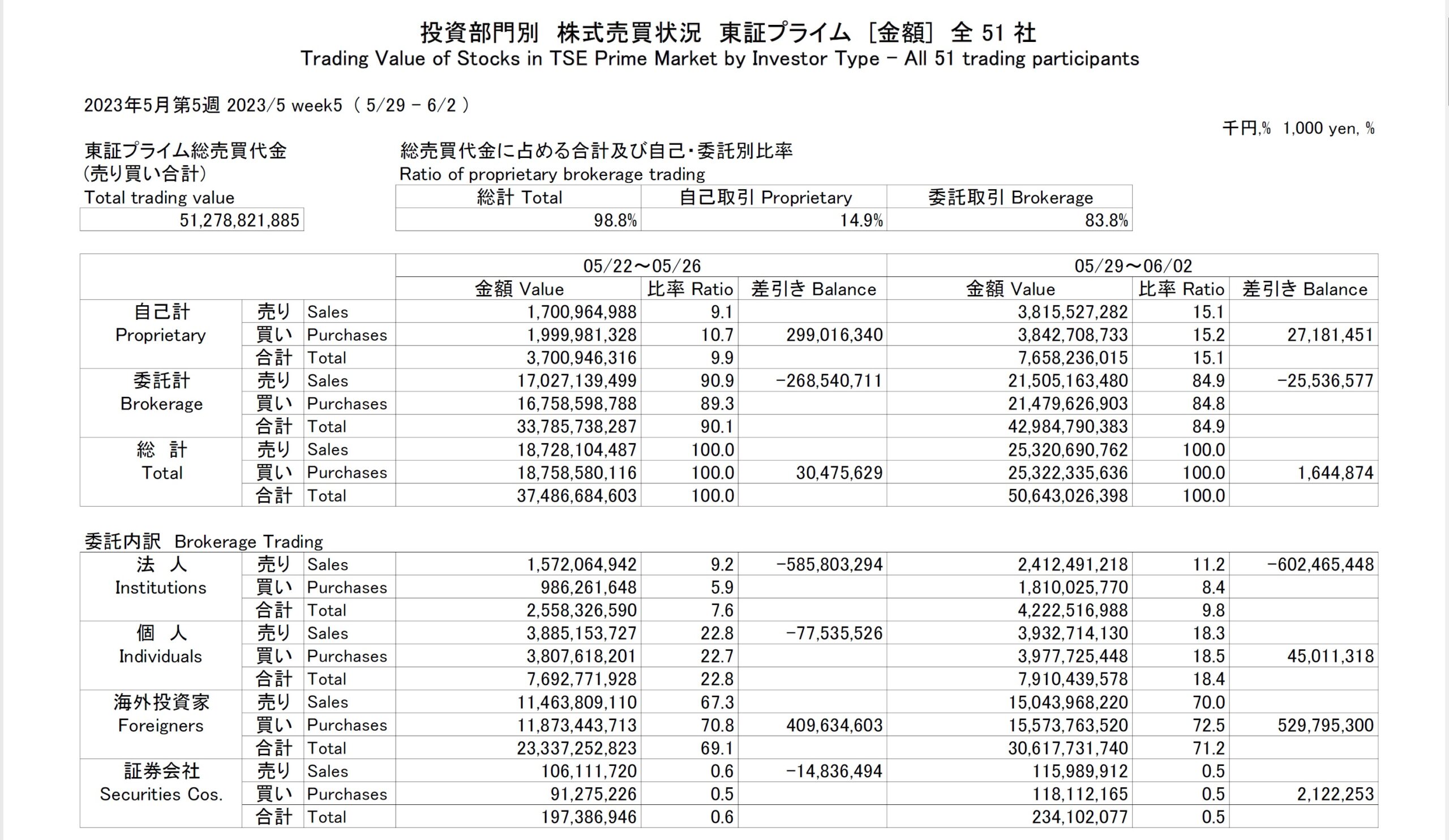 委託内訳の個人と海外投資家の右列(5月29日~6月2日)を比較すると、個人投資家の売り買い合計が7兆9千億円に対して、海外投資家のそれが30兆6千億円と、約4倍の規模であることが分かる。今回は僅かながら、日本の個人投資家も買い越し(約450億円)だ。一方、海外投資家の買い越し額はその前の週の約4090億円から約5298億円へと増加している。一方、日本の法人は約6025億円の売り越し、その前週も約5858億円の売り越しとなっている。