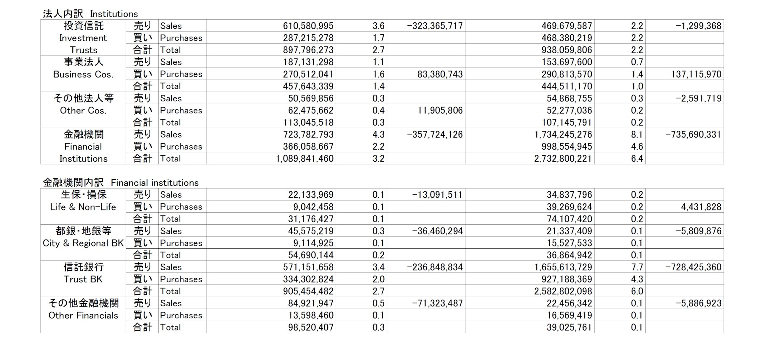 このPDFファイルを更に下にスクロールすると、次のようになっている。見えてくるのは、その日本の法人の内訳だ。事業法人が約1371億円買い越しになる一方、金融機関が約7357億円の売り越しとなっている。そして更にその下の表で確認すると、その金融機関の内、売り越しの殆どが信託銀行だと分かる。バブルの頃はこの信託銀行の中には主に「特金」などの財テク勘定が入ったが、近時は年金基金が殆ど全てとなる。つまり、日本の年金基金がせっせと日本株を売って日本株のウェイトを減らしている傍らで、海外投資家が殆ど一手にそれを買い漁っているという構図が明らかになる。