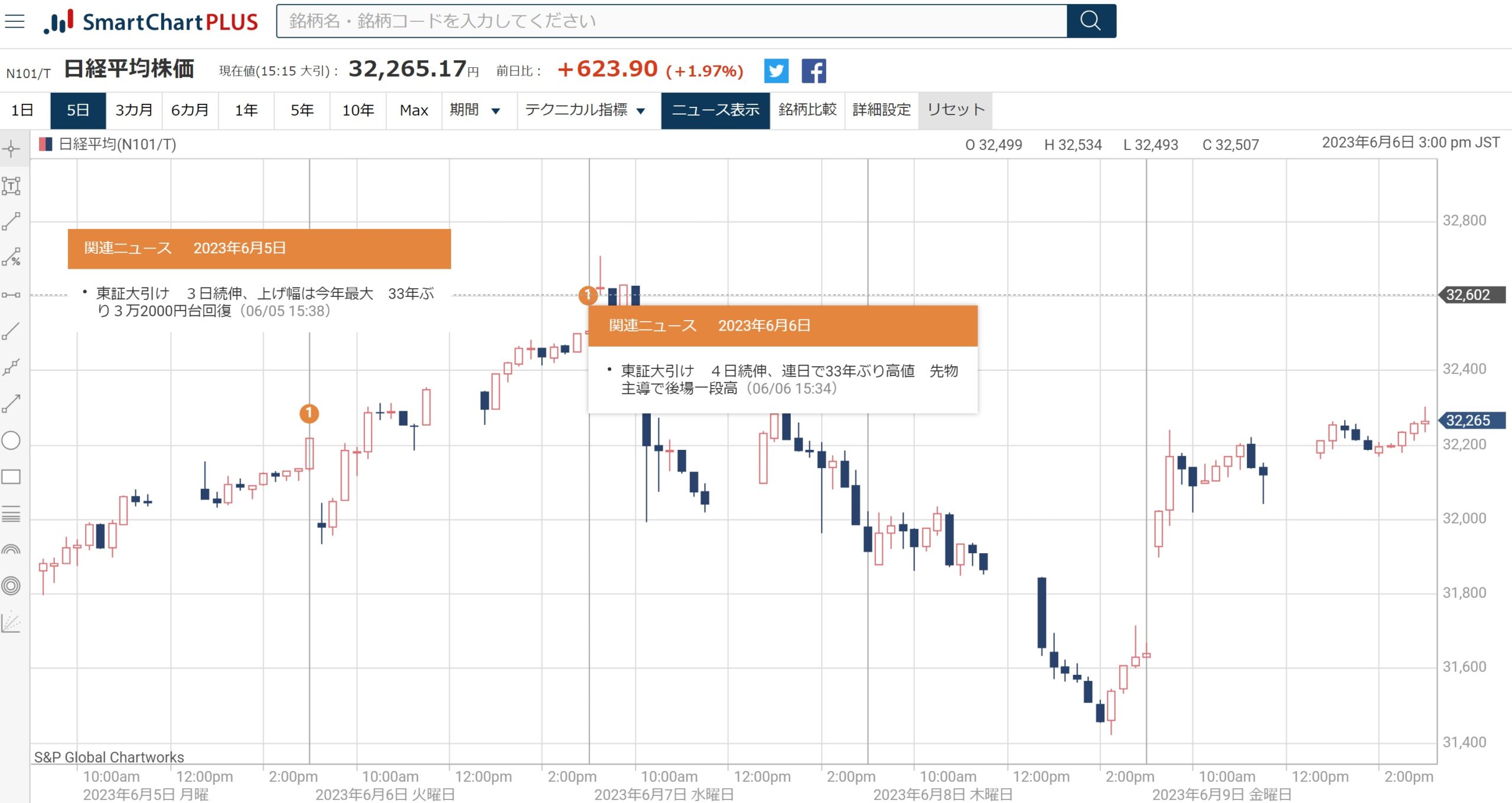 そこで下のチャートをあらためて確認してみて欲しい。これは先週一週間(6月5日から9日)の日経平均株価の動き(日経新聞電子版有料契約があれば見られるWebページ・ベースのサービス)だ。ご覧頂ける通り、33年ぶりの高値で4日間続伸した後、6月7日の大引けは結局前日比593円安となり、その翌日も272円安と続落した。ザラ場ならば、もう200円ほど下値もあったが多少切り返して終わっている。ヒストリカル・ボラティリティが18まで上がる程、足許の動きは荒っぽくなったが、実はとても無機質な印象が強かった。自分が何かとても重要な事実を見落としていない限り、実際にこれだけアップダウンするファンダメンタルな材料が無いということも、この無機質感を強めた要因だと思われる。そしてひとつ気がついたのが、週末6月9日が先物とオプションの同時決済となるビッグSQだったということ。ビッグSQは年に4回、3月、6月、9月そして12月にあるが、昔と違って久しく市場の大きな話題になることはなかった。しかし海外投資家主導のマーケットであり、近時パッシブ運用の比率が上がっていることも含めて考えれば「さもありなん」とも思えるものだ。要は「指数取引で持ち上げられている」に過ぎない可能性が圧倒的に高いということだ。