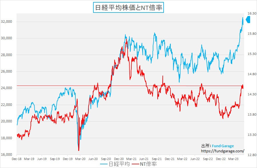 「自分のポートフォリオとの相対比較感」といった定性的な「霊感、ヤマ勘、第六感」的なものではなく、日経平均株価が歪になっていることは、まず例のNT倍率を見ればわかる。NT倍率は日経平均をTOPIXで割っただけの単純な数値ではあるが、市場全体の時価総額加重平均を示すTOPIXの方は、当然にして225銘柄の単純な平均価格指数のように簡単に動かせる(或いは結果的に動く)ものではない。だからこそ、下のチャートの様に日経平均株価が大きくかま首をもたげるような上昇の時に、同様にNT倍率が上昇する様は、正に「日経平均株価が妙に吊り上げられている」と判断することが出来る。