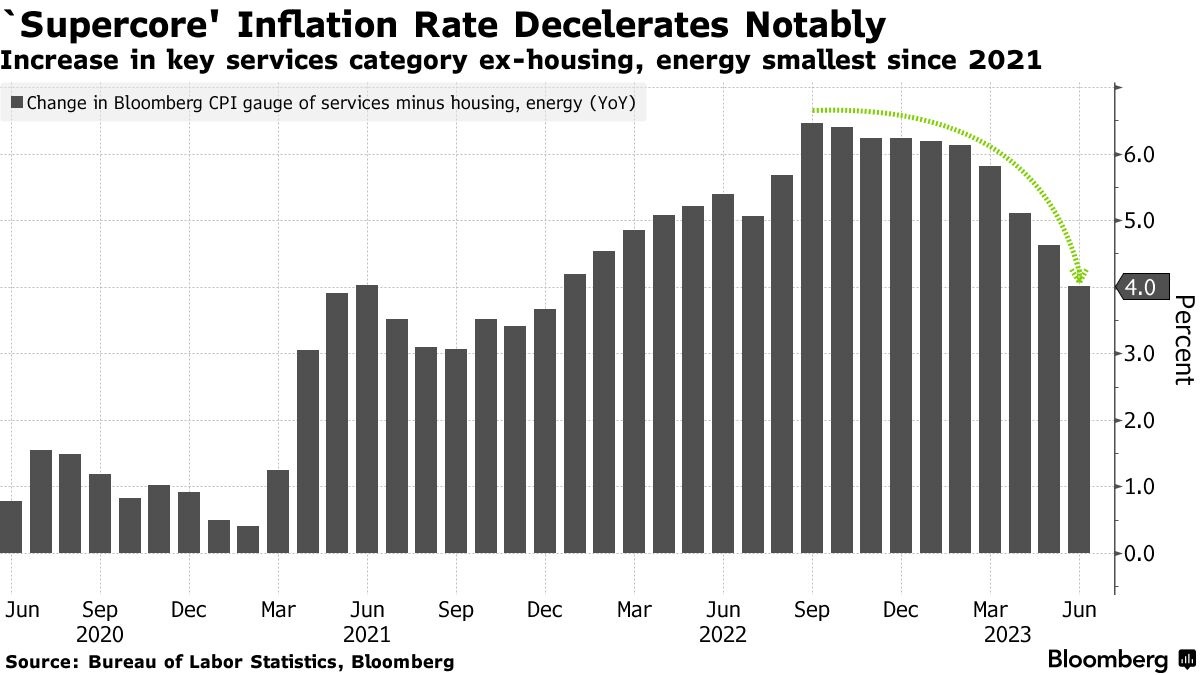 FOMCメンバーが注目するスーパーコアと呼ばれる指数、住宅とエネルギーを除いたサービス価格(残念ながら、上掲の表の数値から計算しようとしても数値が足りない)だが、これは前月比ほぼ変わらずとなり、前年同月比では4%上昇に鈍化、こちらも21年終盤以来の小幅な伸びとなったようだ。Bloombergのチャートを下記にお見せする。