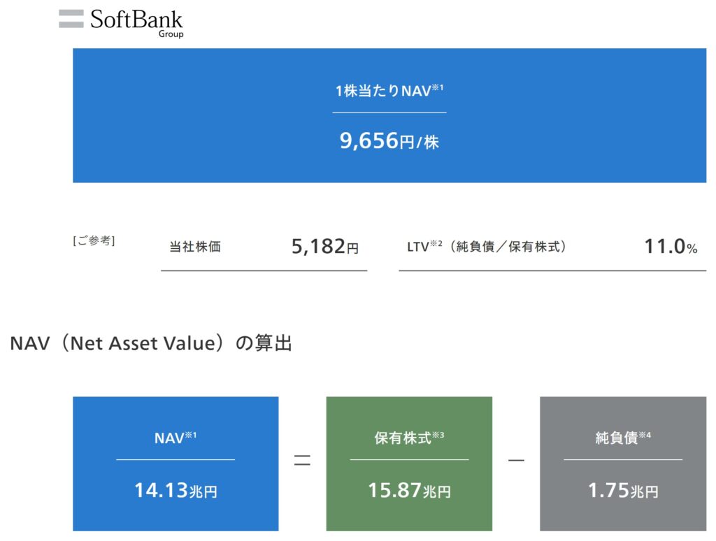 また、自社WebページのIR情報として、下記のような情報を開示している会社がある。そうソフトバンクグループ(9984)だ。自社の純資産総額Net Asset Valueから一株当たりの財産的な価値を計算して公表している。ただこの数字は、恐らく今年最大のIPOとなるであろう半導体企業Armの時価総額を僅か2.87兆円で評価計算したままのもの。仮に上場時の時価総額がこのArmの数字以下になっても、現時点のNAVより現在の株価は低い。ただ一方で、時価会計ではない財務諸表ベースのBPSにより計算されるPBRは、現在1.13倍。この辺りの数字の整合性をどのように評価し、投資家としてどう納得するかがやはり投資の醍醐味だろう。