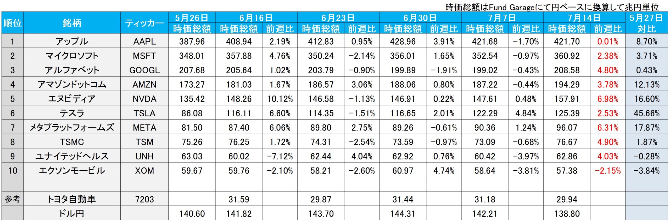 先週のNASDAQの上昇率3.32%の2倍以上の上昇率となったのはエヌビディア(NVDA)の+6.98%だった。このサイズの時価総額の銘柄が平然と上昇するところに今の市場の力強さがあると思う。メタプラットフォームズ(META)も何と6.31%も上昇だ。先週の株価指数騰落率の中でベストパフォーマーのインデックスとなったNASDAQを上回るという意味では、アマゾンドットコム(AMZN)、TSMC(TSM)も健闘している。