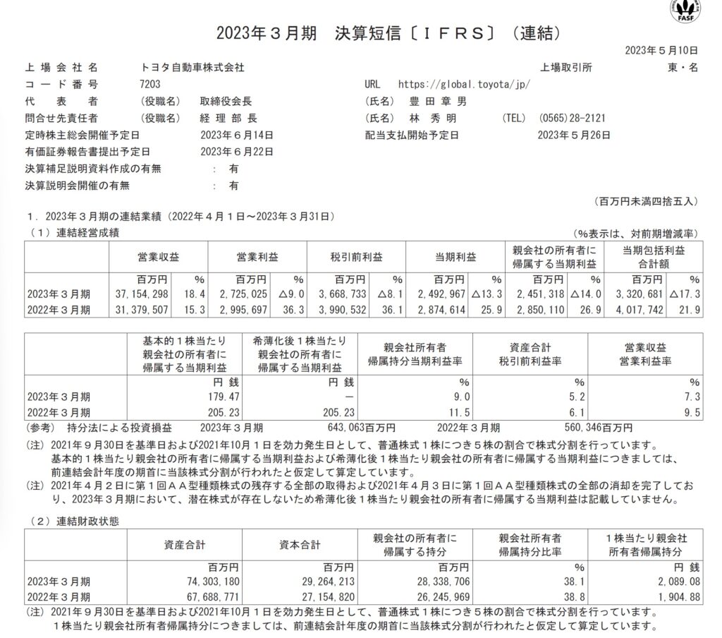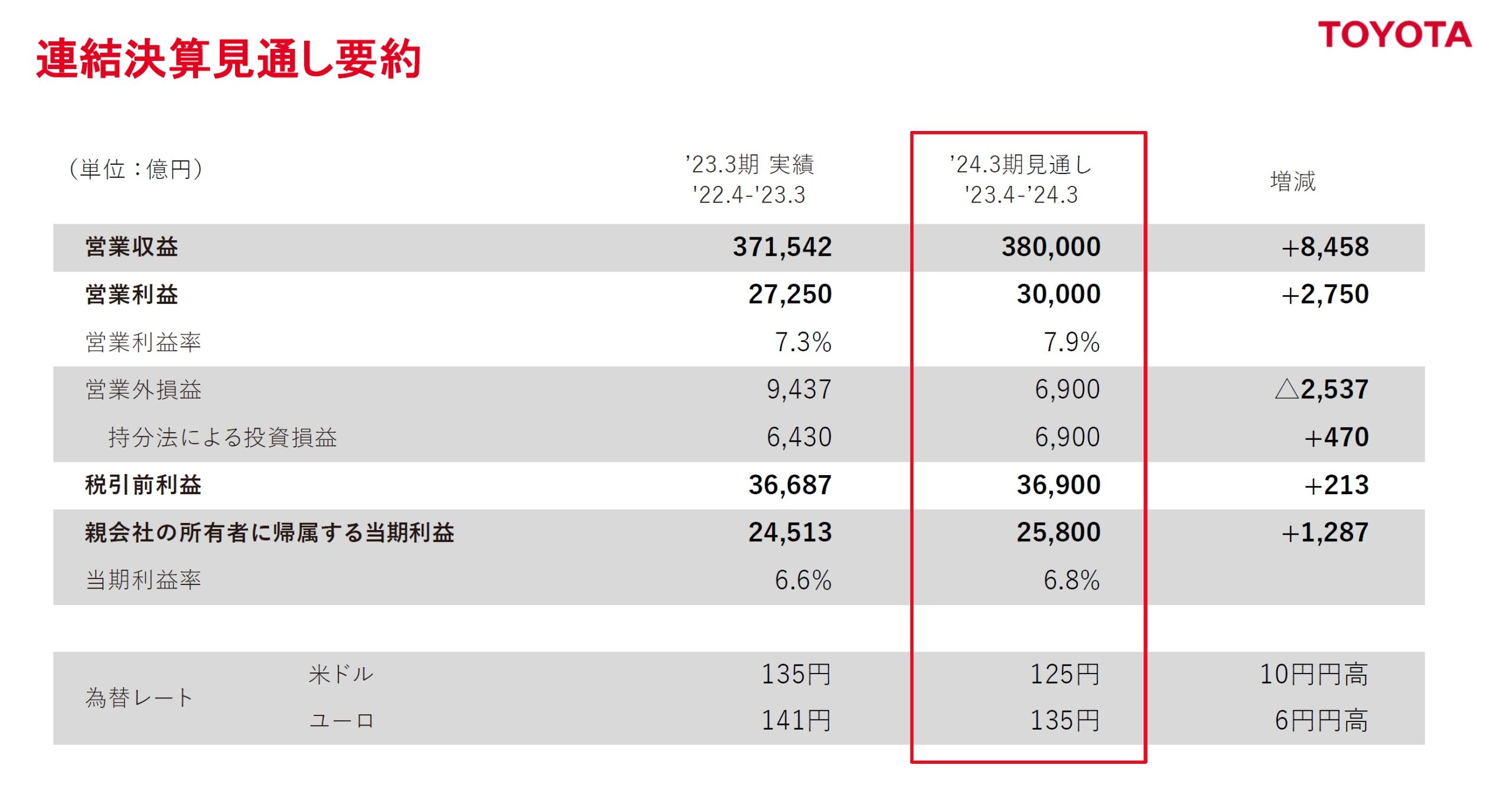 因みに、トヨタ自動車の2023年度(2024年3月期)の通期予想に使われている前提為替は1ドル125円、1ユーロが135円なので、現状の水準でも相当に為替差益がプラス要因として計上される筈。少なくとも4‐6月期の1四半期分は上乗せになった筈だ。何せ期初の通期予想では、為替はドル円ベースなら10円分の為替差損を織込んで計算されており、それが正反対に、差損どころか、為替差益に置き換わる。