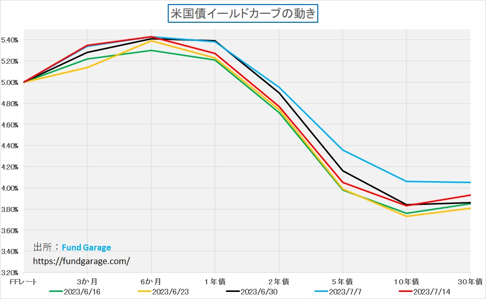 ならば何故、米国金利は低下したのかと言えば、これは先週発表された米国の物価統計であるCPIとPPIの内容がインフレの鎮静化を示したからだ。そして市場は7月のFOMCでの利上げは回避出来ないものの、7月で利上げ局面は打ち止めになるだろうと考えられたからだろう。だからこそ、年内あと2回の利上げを織り込む方向へ動き始めていた長期債利回りも、年内あと1回の利上げへと修正が入ったと考えられる。この間のイールドカーブの動きを示すと下記の通りだ。ご覧頂ける通り、前週末7月7日(青線)に比べると、先週末14日のそれ(赤線)は5年債利回りで△0.31%、10年債利回りで△0.23%、30年債利回りで△0.12%の下落と、ほぼ1回分程度の利上げ幅を取り消すかのように動いている。