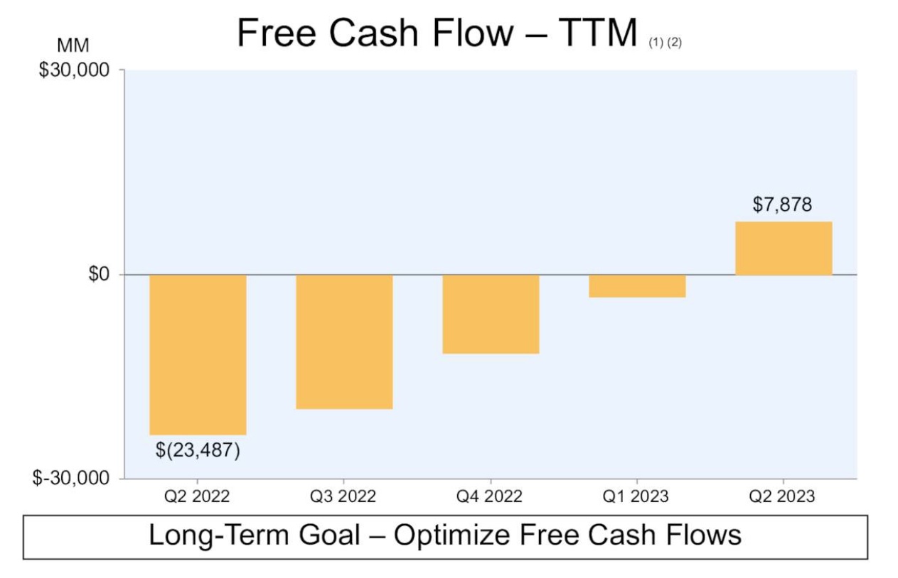 8月3日に発表されたアマゾンドットコム(AMZN)の4‐6月期決算では、フリーキャッシュフローが漸くこの四半期でTTMベースでポジティブに変わったことが明らかになった。下のチャートで示す「Free Cash Flow-TTM」というのは、過去12ヶ月間のフリーキャッシュフローのことで、フリーキャッシュフローとは、事業活動によるキャッシュフローと投資活動によるキャッシュフローの差分として計算され、企業の健全性や資金の使い方を評価するための重要な指標の一つのことだ。当然、ポジティブであるとは、要はキャッシュを生み始めているということになり、ある意味では「黒字化」ということ以上に重要な財務指標と言えるかも知れない。何故なら、アマゾンドットコムのビジネスは、設備投資(フルフィルメントセンターにも、データセンターにも、そしてその他のプロジェクトにも)に相当ふんだんに資金を投じざるを得ない業態だからだ。それがこの四半期にTTMでポジティブになったということ極めて注目に値する。