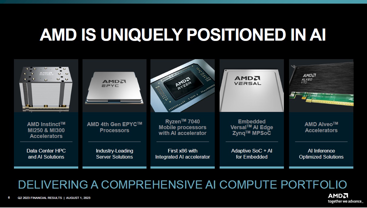 自らも「UNIQUELY POSITIONED IN AI」と呼んでいるように、AMDの製品群は株式市場には簡単には理解されないリスクがある。下記の製品群を見て、サクッと「あれはそれで、これはあれ」と端的に説明出来る人は、相当に勉強していないと少ない筈だ。左からふたつ目のEPYCはサーバー用のCPU(インテルで言うとXEONに相当)であり、その右横がノートパソコン用のCPUだが、AI acceleratorも搭載したRyzen7の新しいモデルというところぐらいまでは知っている人も多いだろうが、残りの3種類については如何なものだろうか。