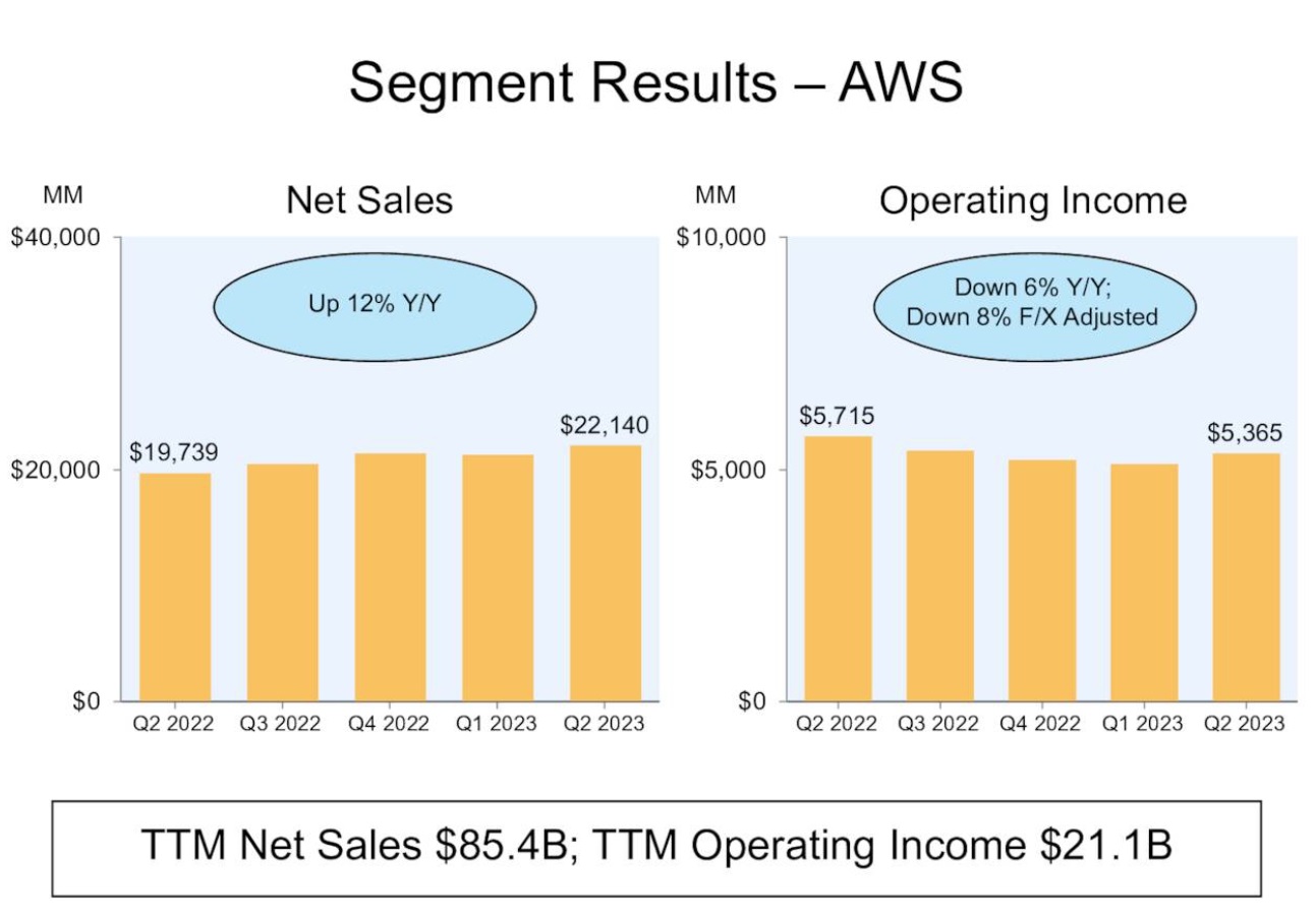 勿論、アマゾンの重要なビジネス、祖業はイーコマースだが、ご存知の通り、現在は世界最大のクラウド・サービス・プロバイダーでもあり、恐らく多くの人が知らない内にその恩恵に預かっているであろうほど、多くの身近な企業が既に利用している。下のチャート、左側が四半期ごとの売上であり、対前年比だと12%アップ、対前四半期でも売上の方はプラスだ。一方で右側のOperating Income、すなわち営業利益ベースで見ると、この四半期で漸く前四半期を上回ることが出来たことが分かる。実はこの「前四半期ベースでプラスにならない」ことがこの数四半期、ウォール街に非常に評判が悪かった。前回決算の時にもご案内したが、アマゾンはお客様に自ら「より安いプランへの切り替え」を提案し、クラウドサービスの本質的なメリット、コンピューティング費用を変動費に出来るということをカスタマーエクスペリエンスとして提供し続けてきた。今回、アンディ・ジェシーCEOが言っているのは、そんな前四半期ベースでもOperating Incomeが伸びずに売り上げだけは伸びていたということは、実は顧客ボリュームは増えていたということを意味する。そしてここに来て、顧客サイドの方から、変動費として安くする局面は終了して、これからはより処理を増やす方向、すなわちコンピューティング能力の増強、すなわち生成AIへの取組みへ持って行きたいと言われているというコメントがあった。つまり、損して得取れの、損をする時が過ぎ、ここからは得を取る段階に、今までの努力の回収期に入ったと見ることが出来る。