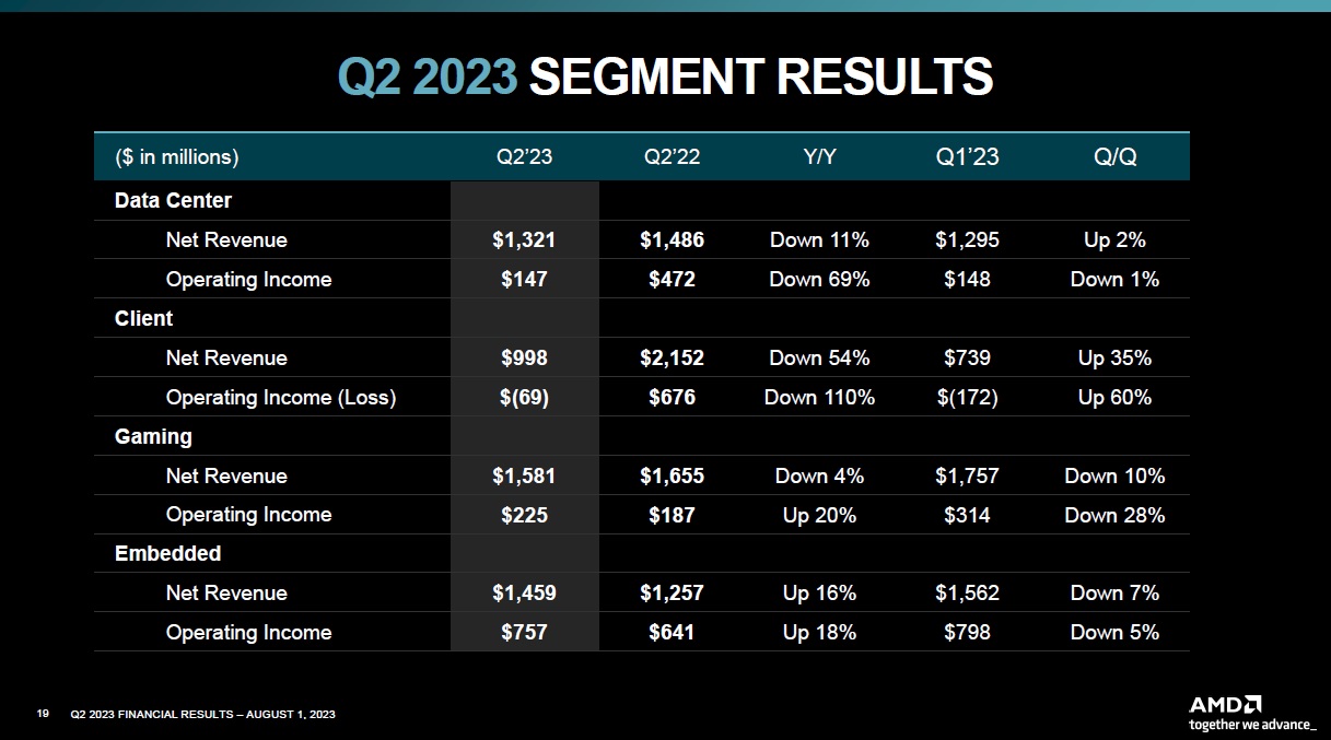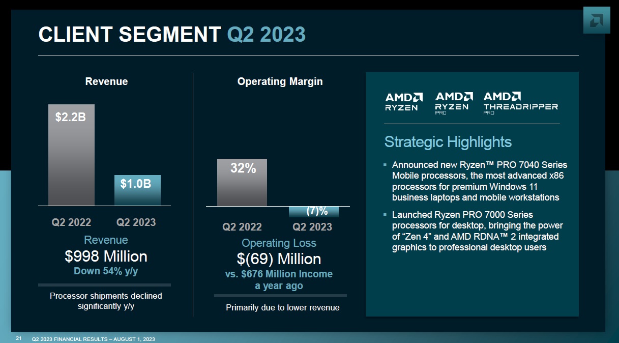 これはAMDの今期の決算資料のセグメント別の情報だが、単純にデータセンターとクライント、そしてゲーミングだけを見るならば、従来のインテルの競合のAMD、或いはGPUではエヌビディアのライバルのAMDという単純な図式にしか見えてこない。クライアントとは要するにパソコンであり、昨今のマクロ環境などでお馴染みの通り、半導体メモリー価格の下落をもたらす程、在庫がだぶついたような分野が主たるビジネスフィールドに見えてしまう。事実、前年同期比では見事にRevenueが半減していることが分かる。そして残念なことに、パソコンやスマホといった、パンデミック時に需要を先食いしたとされるセグメントの戻りは業界としても悪いままだ。