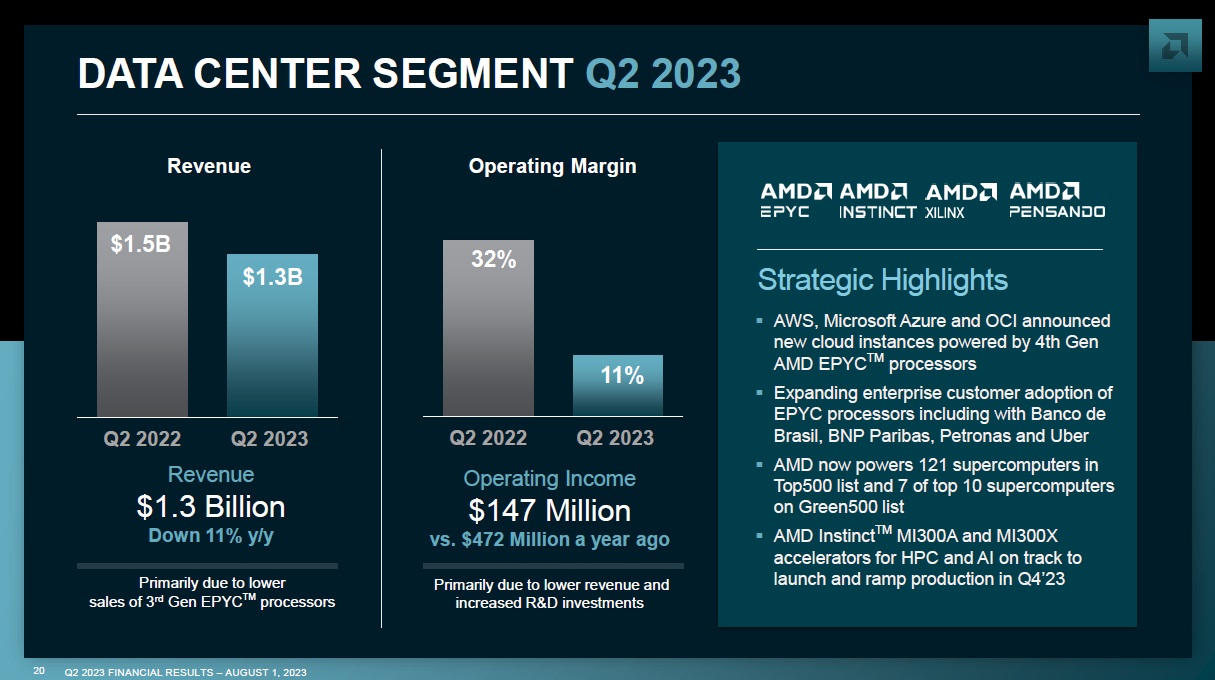 そして最後に、AMD Instinctとは、AMDが開発したデータセンター向けのアクセラレータ製品ラインで、高性能コンピューティング(HPC)や人工知能(AI)アプリケーション向けに設計されているものであり、そのMI300AとMI300Xは、このラインアップの新しい製品として、2023年の第4四半期に公式に発売され、生産が増加する予定だという。これは、AMDがHPCとAIの市場において更なる拡大を目指していることを示しており、正直、ここまでのセグメントではマクロ環境を超えて、陰りは殆ど感じられない。