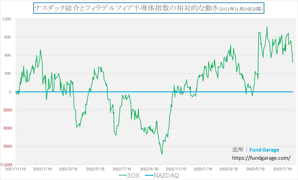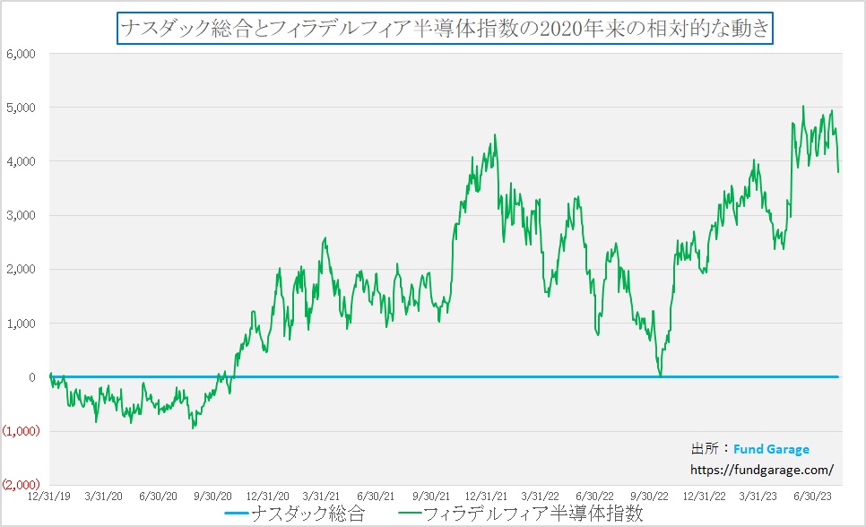 SOX指数は足許でNASDAQに対するアウトパフォーム分を一気に吐き出しているが、SOX指数の構成銘柄とそれが時価総額加重平均の指数であり、エヌビディア(NVDA)だけで約3割、2番目に大きい時価総額のTSMC(TSM)と合わせると時価総額の占有率が約4割を優に超える歪な指数であることを考えると、まさにこの結果はエヌビディアの下落分が大きいことが明らかになる。だとすれば、これは確かに生成AIのブームが起きた流れと何となくイメージは一致するのだが、期間を変えて2020年の初めからの流れで見ると、少々違った考え方が必要となる。それをイメージ出来るのがこのチャートだ。