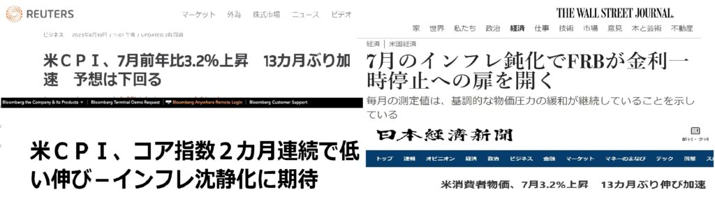 恐らく先週の株価下落理由の最も適切かつ妥当な理由は「利食いが利食いを生んだ」に尽きるだろう。サマーバケーションの前、不在中に市場が下落して「売っておくべきだった」と後悔したくない、或いは「旅費の一部」にする、そうした理由で利食いを入れたら、多くの人が同じ考えだったというのがリアルな現実だと思われる。誰だってアクセルの踏みっ放しよりは、時々緩めたくなるだろうし、評価益を現実の実現益として使いたくもなるだろう。先週発表されたCPIやPPI、具(つぶさ)に見てみても、決して金利上昇をサポートするような内容にはなっていない。というよりは、寧ろ「来月9月のFOMCでは利上げは無さそうだ」という読みを導くものだった。ご参考までに、主要メディアがCPIの結果について報じた時のヘッドラインを並べてみた。対象としたのは、ロイター通信、Wall Street Jounal、ブルームバーグ、そして日経新聞だ。見出しからの印象は個々の人で異なると思うので、敢えて言及しないが、各報道機関の基本スタンスが垣間見えるから面白い。