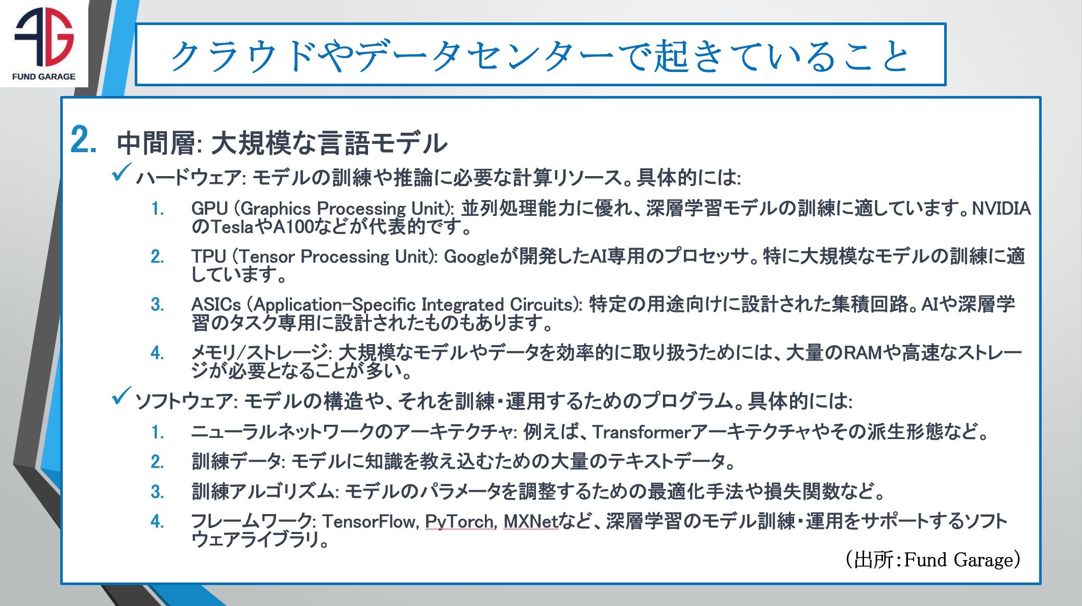 - 説明: このレイヤーは、大言語モデルの基礎を形成するモデルのトレーニングや、推論(予測)を行うための計算能力に関連している。