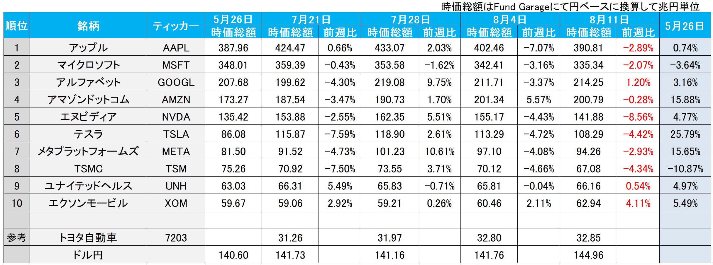 下記に示したのは米国株時価総額上位10番目までの銘柄の週間騰落率。先週は、エヌビディア(NVDA)が△8.56%、TSMC(TSM)が△4.34%とNASDAQに対してでさえ、その騰落率の4倍超、2倍超とそれぞれ大きく下落している。この流れがフィラデルフィア半導体指数ことSOX指数の下落をリードし、次いでNASDAQに影響し、当然その半分はS&P500の下落もリードした。ただエクソンモービル(XOM)のようなエネルギー関連は逆に堅調であり、ユナイテッドヘルスなども好調、ということでNYダウは下落しないどころか寧ろ上昇している。