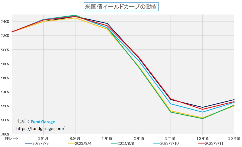 その感覚を頭に入れて置いて貰った上で、下記のイールド・カーブのチャートを見て頂きたい。これは前週、格付機関フィッチレーティングスが米国債の格下げを最上位の「AAA」からワンノッチ引き下げた「AA+」にした時のピーク水準を黒の線(8月3日)、その翌日4日に元に戻った時を黄色の線(4日)とし、先週の物価統計が発表になる前日8日を緑の線、そしてCPI発表の日を青色、PPI発表の週末11日を赤色の線で示したものだ。10年債利回りで言うと、8月3日が4.18%、4日が4.03%、8日が4.02%、10日が4.11%そして11日が4.15%となる。確かに8日に比べれば、CPIの発表後の10日は9bpは高いと言えるが、CPIの翌日のPPI発表では4bpしか上昇してない。断言出来るが、この金利上昇幅で、前述の教科書的な「将来想定される利益を現在の価値に換算する割引率が高くなり・・云々」とばかり、その分のポジション調整の売りを出すようなポートフォリオもファンドマネージャーも存在しない。