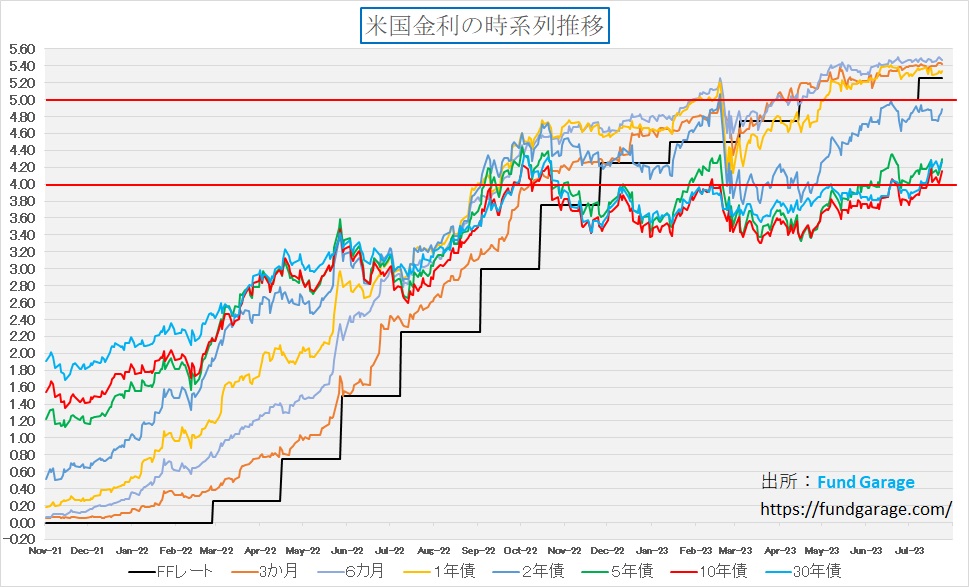 下記に示したのは、FRBが金利を引き上げ始めて以降の、各残存期間の利回り推移を示している。分かり易いように、4%と5%に赤線を入れてある。荒っぽい言い方をすれば、昨秋2022年10月前後から金利は大きくはその位置を変えていない。FFレート(短期金利)はその間に明らかに1.5%以上は上昇しているにも拘わらずだ。要は短期金利系はFRBの利上げによりFFレートの誘導水準が上昇することで、概ね5%前後(現状は誘導目標は5.25%~5.50%)に絡みつき、期間5年以上の長期金利は4%前後に絡んでいるということ。本来、この長短逆転現象は金利の期間構造として好ましい状況ではないが、例えば「10年債利回りが4.2%前後になると、そのインカムゲイン(利息収入)レベルを確保出来れば充分」という資金が債券を買いに来てしまうということだ。「買う」人が居て、ある一定水準以下に債券価格が下落しない限り、利回りは上昇しない。