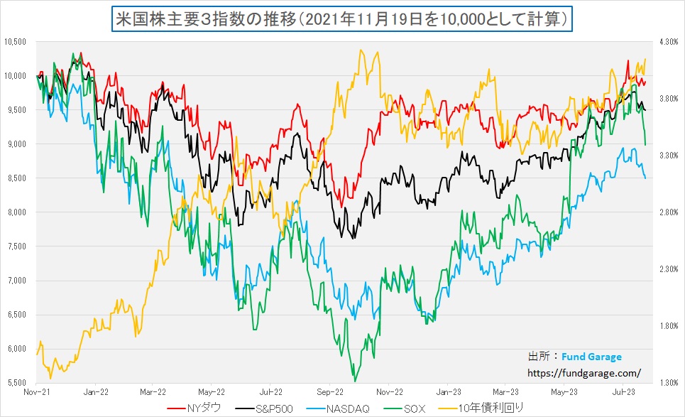 下のチャートで明らかな通り、黄色で描いた長期金利の上昇とかなり明確に、そしてレバレッジが掛かったかのように取り分けフィラデルフィア半導体指数ことSOX指数が負の相関となっている。NASDAQの下落をも完全にオーバードライブ(超過)する勢いでSOX指数は下落している。