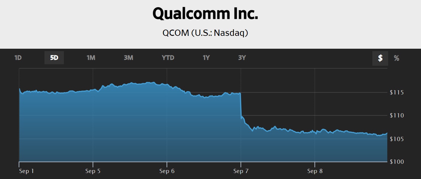ならば何があったかと言えば、アップル(AAPL)に関しては「中国の政府や国有企業でiPhoneなど海外メーカーの電子機器の使用制限が拡大している」、或いは「今回の通知は腕時計型端末「アップルウオッチ」やワイヤレスイヤホン「AirPods(エアポッズ)」なども対象に含み、職場への持ち込みも禁止するという」とまで報じられているからだ。今やGDPで日本を遥かに追い越し、世界第2位の経済大国(の筈)にのし上がった中国で、その利用が制限されるということに対して、市場が反応したからだ。恐らく、その連鎖反応的に「中国でのGPUの売上が落ちる」と危惧してエヌビディア(NVDA)も売られたのだろう。その意味では、下に示したクアルコム(QCOM)の下落はより著しい。ただ、時価総額ベースでは第91位に過ぎない(それでもソニーグループやNTT、MUFGなどよりも全然大きいのだが)こともあり、指数インパクトはアップルなどの比ではない。アップルは一社でクアルコムの約24倍の時価総額を持つのだから。