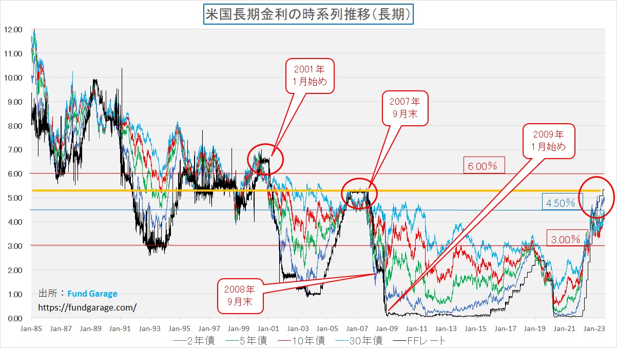 「逆イールド」の状況は、本来「金融引き締め期」において、先々の「経済成長率」が低下することで長期金利がより早く低下することを織込んでいる。だとすれば、来年のいずれかのタイミングで利下げがあるとするならば、イールドカーブの正常化の流れの中で、多少長期金利が上昇しても何ら驚く必要は無いだろう。以前もお見せしたチャート、1985年からの長い時間軸でみた金利の推移だが、長期金利の水準を含めて、決して今の金利水準は高いというわけではなく、仮にもし短期金利が利下げによって下がるとするならば、より現状の長期金利の水準は正当化される。