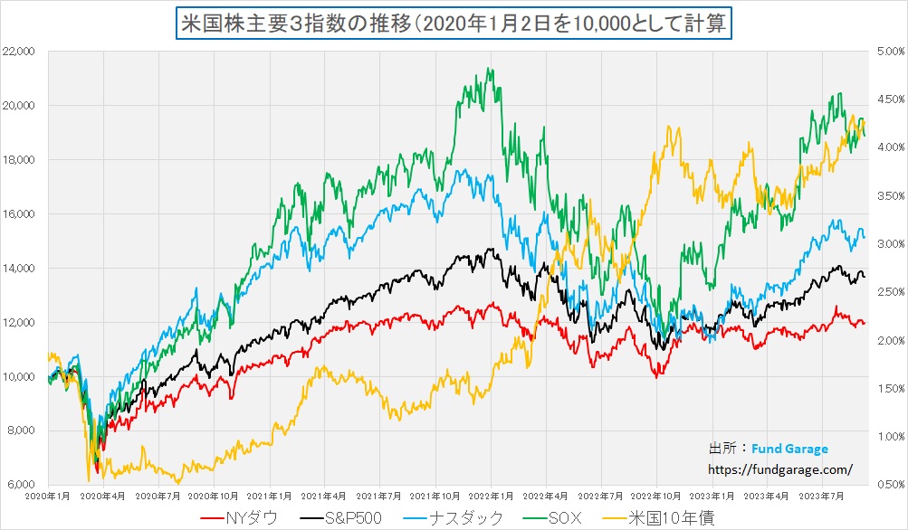 日本株も加えて比較すると単にややっこしくなるので、米国株と米国金利だけで話をさせて頂くが、投資環境を考える時に「チャートの起点をどこにするか」というのは、普通に考える以上に大きな差異をもたらすものだ。これから2種類のチャートをお見せる。比較対象になっているものはどちらも同じで、NYダウ、S&P500、ナスダック、SOX指数(フィラデルフィア半導体指数)、そして米国10年債利回りだ。利回りは右軸に対応している。では、最初はこのチャート。起点を新型コロナウイルスの感染拡大が始まった2020年1月としたものをご覧頂こう。