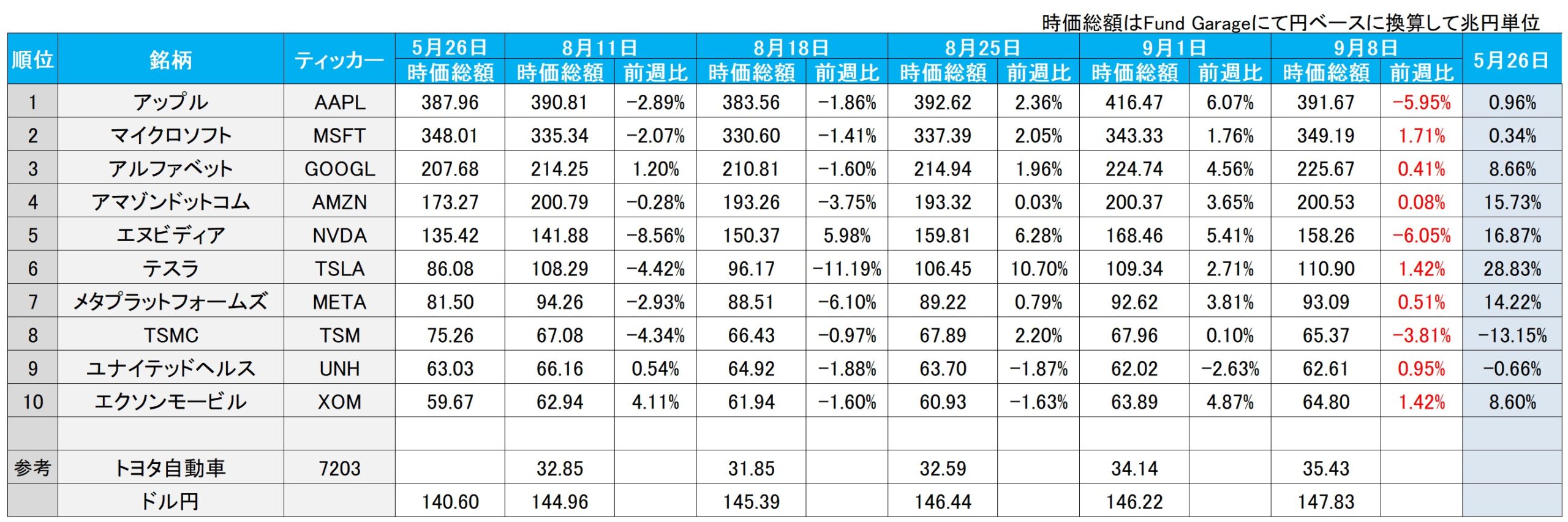 そして下のテーブルを見て貰えば、何が起きたかも一目で分かるだろう。つまり、時価総額トップのアップル(AAPL)、そして第5位のエヌビディア(NVDA)が共に対前週末比で約6%前後の下落となったからだ。TSMC(TSM)も約4%近く下落している。その一方で、原油高もあってエクソンモービル(XOM)は僅かに買われている。これが端的に市場騰落率が日経平均>NYダウ>S&P500>NASDAQとなった理由だ。