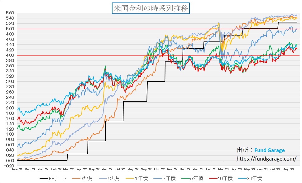 続いては、時系列にもう少し長い時間軸で各期間の金利の動きを見て貰おう。赤い水平線は4%と5%のところにある。何が分かるかと言えば、強いて言えば、4月の終わりから5月の始めを底にして、徐々に中長期の金利がじりじりと上昇してきているということ。これを見て、もし長期金利は上昇トレンドに入ったんだと慌てることは無い。何故ならば・・・。