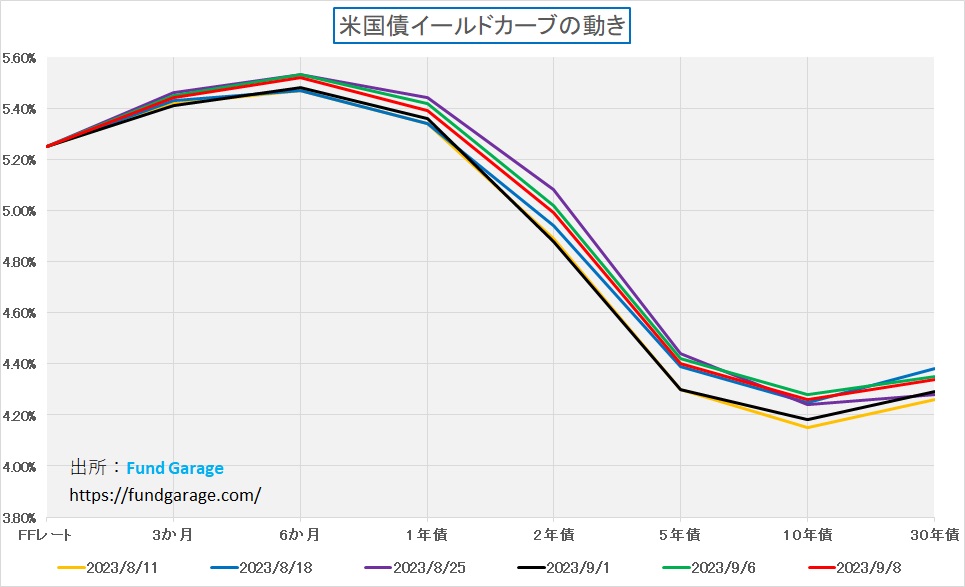 赤線が先週末の8日、黒線が前週末の1日だ。その他、過去4週末分と先週一番イールドカーブが上にシフトした6日を緑線で引いてみた。ご覧頂ける通り、この間の10年債利回りの一番上が4.28%、下が4.11%、先週一週間に限って言えば、上が4.28%、下が4.18%でしかない。ご承知の通り、FRBが利上げ、若しくは利下げする際の「1単位」は0.25%だが、実にその半分も動いていない。付け加えるならば、本来「棒を振り回す」時と同じように、手許(短期金利)の動きは、棒の先(長期金利)の方ではより増幅されるのが物理の基本。材料が無い中で僅かに動ているに過ぎないことがお分かり頂けると思う。