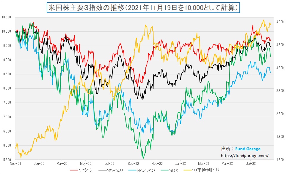 2021年11月19日は何の日だったかと言えば、ちょうどNASDAQが終値で史上最高値をつけた日だ。そこを起点として各指数を10000ポイントから指数化して表したのがこのチャート。中身は先程と全く一緒、ただ時間軸だけを変えただけなのだが、相当に印象は違ってくる。例えばNYダウは7月下旬には一度2021年11月19日の水準を取り戻しているが、一方でNASDAQは今現在でも約15%は凹んだままだ。SOX指数は落ち込みも大きかったが、一方で一時はNYダウと共に元値を回復しそうなところまで上昇して、足許でやや下落してきたという感じだ。