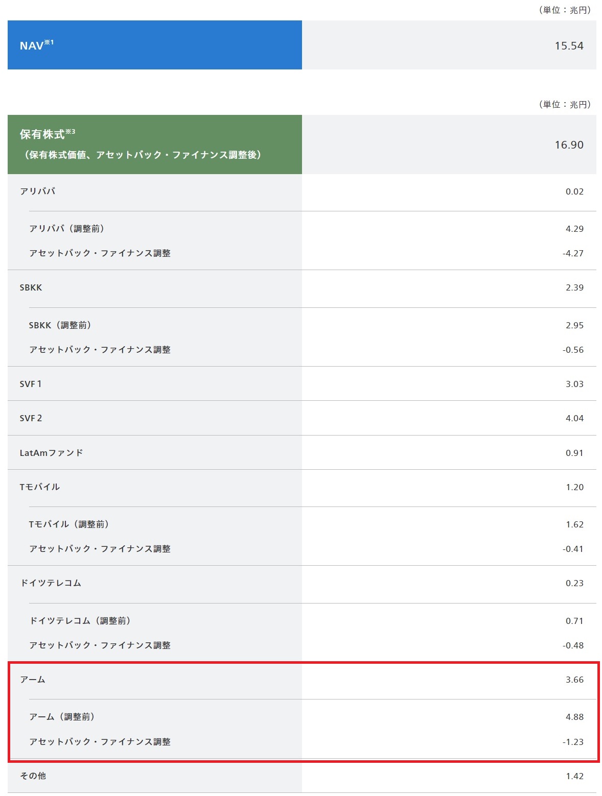 この一株当たりのNAVを計算するための根拠も開示されているが、保有する株式の評価等は下記の通りになっている。赤枠で囲んだ部分がアームに関わる部分だ。これで見ると、アセットバックファイナンス前の元の時価総額は4.88兆円で計算している。これが今回、現金収入も併せて約10兆円と倍増した訳だ。アセットバックファイナンス部分を調整すると、△1.23兆円なので、3.66兆円から8.77兆円となる。トータルのNAVは15.54兆円なので、これも20.65兆円になると計算出来るので、すなわち一株当たりのNAVは10,616円株×20.65兆円÷15.54兆円=14,106円/株と計算上では考えることが出来る。先週末金曜日のソフトバンク・グループ(9984)の東証終値は6,718円。この株価をどう見るかは投資家個々の判断でしかない。