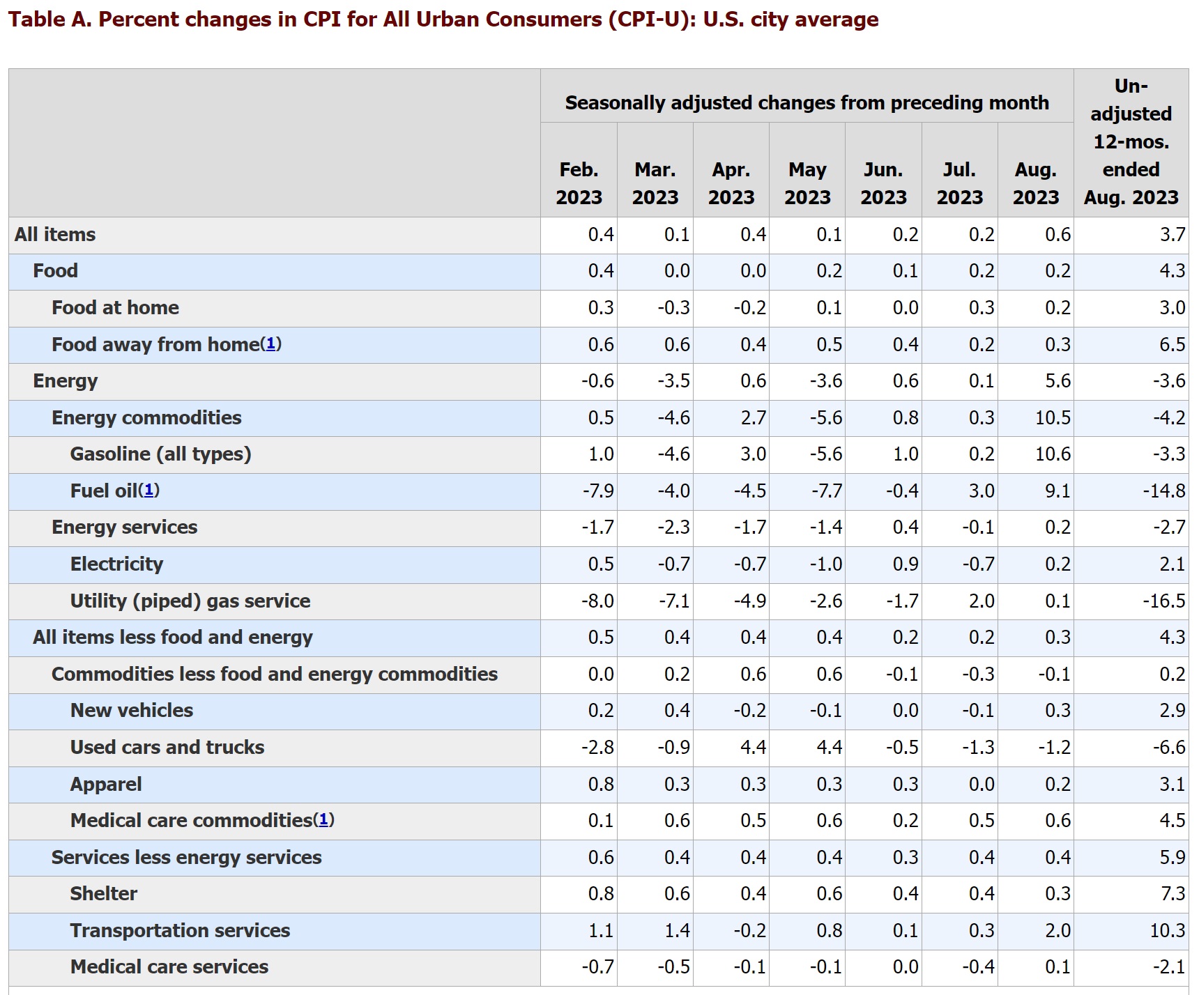 前月比は0.6%の上昇、昨年6月以来最大の伸びとなったが市場予想とは一致した。労働省の発表コメントによれば「The index for gasoline was the largest contributor to the monthly all items increase, accounting for over half of the increase. Also contributing to the August monthly increase was continued advancement in the shelter index, which rose for the 40th consecutive month. The energy index rose 5.6 percent in August as all the major energy component indexes increased. (前月の全品目上昇に最も寄与したのはガソリン指数で、上昇分の半分以上を占めました。8月の対前月比増には40か月連続で上昇した住宅指数の継続的な上昇も寄与しました。 主要エネルギー構成指数がすべて上昇したため、エネルギー指数は8月に5.6%上昇しました。)とある。