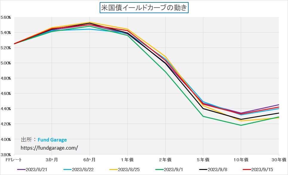 下記に作ったイールドカーブのチャートを見てみると、現状のイールドカーブは何を隠そう、ジャクソンホール会議直前の状況に殆ど一緒なことが分かる。またジャクソンホール会議直後の8月25日に比べると、中短期の金利は寧ろ低下している。つまりイールドカーブ自体は極々僅かにフラットニングしたということ。現状与えられる情報だけでは、流石に債券市場関係者もそう簡単に決め打ちをFOMC前に打てない状況を示している。