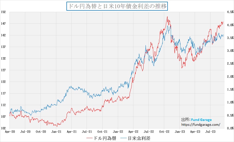 先週末のドル円終値は147.85円と2022年11月3日以来の円安で終わった。ただ足元の為替の動きは投機筋によるもので実需を反映しているとは思えない。為替相場はそもそも実需で動くというよりは、基本性格からして「投機的な動き」をし易いものであるが、「日米の金利差」という論点で考えるならば、現状は「FRBはタカ派になる」という方向性に賭けているとしか思えず、今週のFOMCを境に、来週ぐらいから落ち着きを見せるだろうと考える。それを確認出来るのが下のチャートだ。