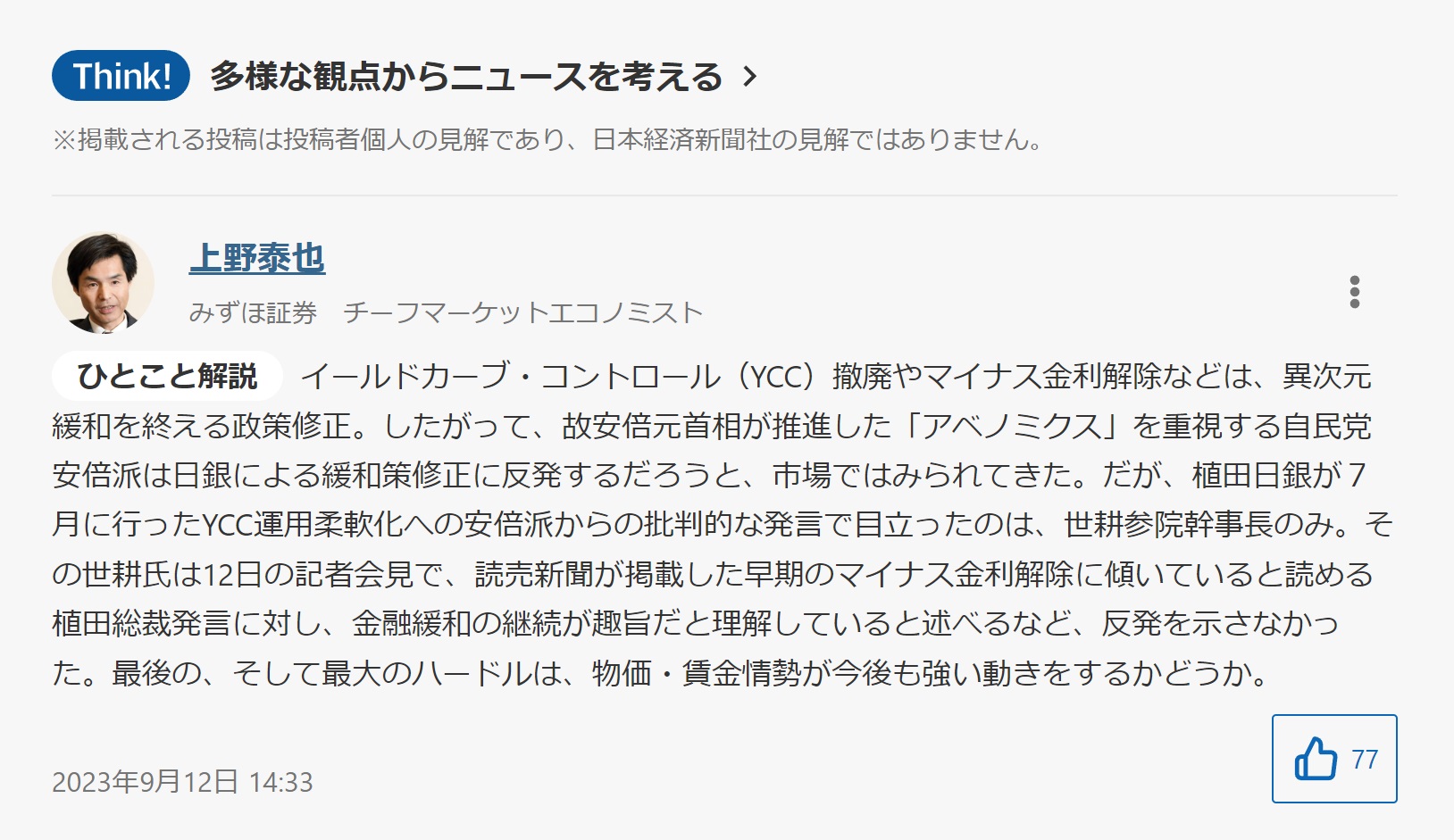 まずこの小見出しを見て驚かれた方にはお詫び申し上げる。でもこのプレミアムレポートの小見出し程度でも驚かれるのだから、これが天下の日経新聞の記事に正式に見出しになっていたとしたらどうだろう。正直、私自身も心から驚いてしまった。それはマイナス金利解除、24年1月決定・2月実施が最短か  編集委員 清水功哉というこの記事。編集委員の名前入りのコラムに過ぎないと言ってしまえばそれまでなのかも知れないが、正直なところ、日経新聞社の真意を測りかねる。何かを何処かに意図的に誘導したいのか、そういうポピュリズムを芽生えさせようと言うのかとしか思えないからだ。