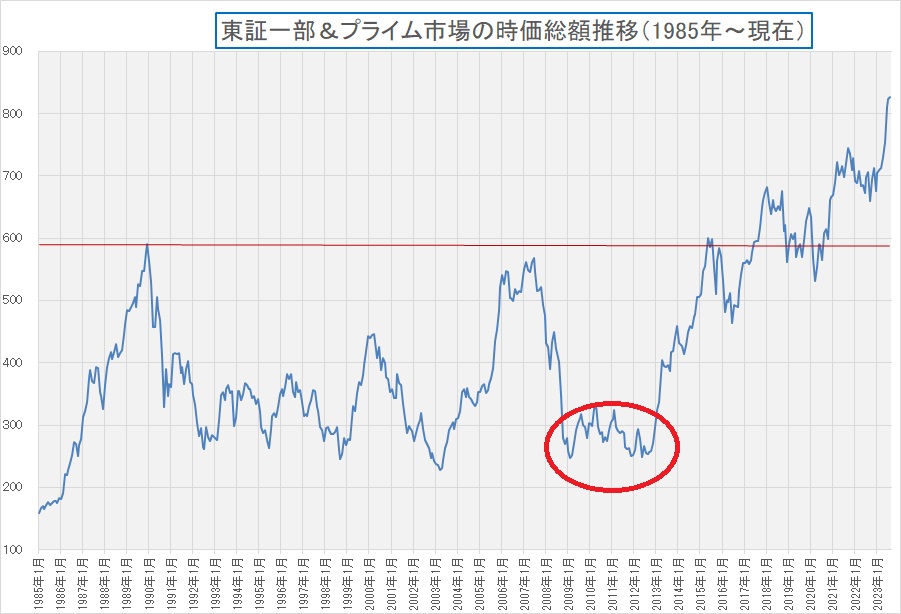 念のため、日本の株式時価総額のチャートもお見せする。赤線を引いたラインが1989年12月、昭和バブルの日経平均株価の最高値の時だ。何のことは無い、(諸々の小理屈をつけて)採用銘柄の入れ替えを頻繁に行ってきた「日経平均株価」はまだまだ史上最高値には程遠いが、上場企業の時価総額自体はとっくにその水準を上抜けている。つまり、日本経済は当時よりもしっかり拡大したということだ。ただ明らかに、リーマン・ショックによって、その願いは一旦は途切れ、民主党政権時代に長引き、そしてアベノミクスなり、黒田バズーカなりで一気に取り戻したということだ。