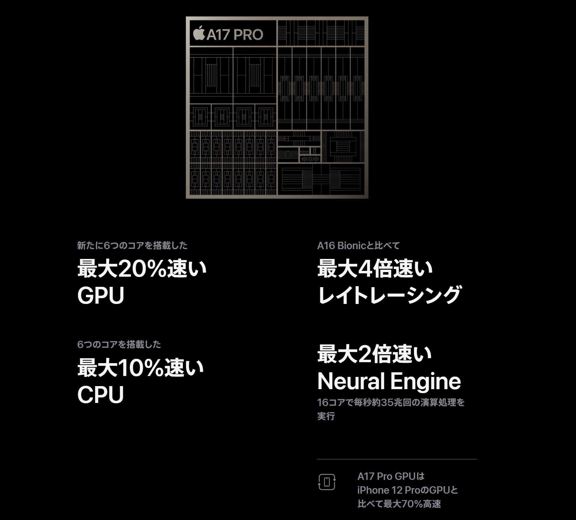 A17 Proには190 億個のトランジスタが搭載され、前モデルの A16 Bionic の 160 億個のトランジスタ数を約2割近く上回っている。A17 Pro は、2 つの高性能コアと 4 つの高効率コアを備えた 6 コア CPU (同じタイプのコアが6個ではないところが面白い)を搭載しており、従来よりも最大 10% 高速化されている。また、16 コアのニューラルエンジンを搭載しており、1 秒間に最大 35 兆回の演算処理が可能で、前世代と比較して機械学習モデルの処理速度が最大2倍向上している。A17 Pro は、ハードウェア・レイトレーシング※を導入した新しい GPU を搭載しており、コンソールクオリティのゲームを実現しています。」ということがポイントとなる。