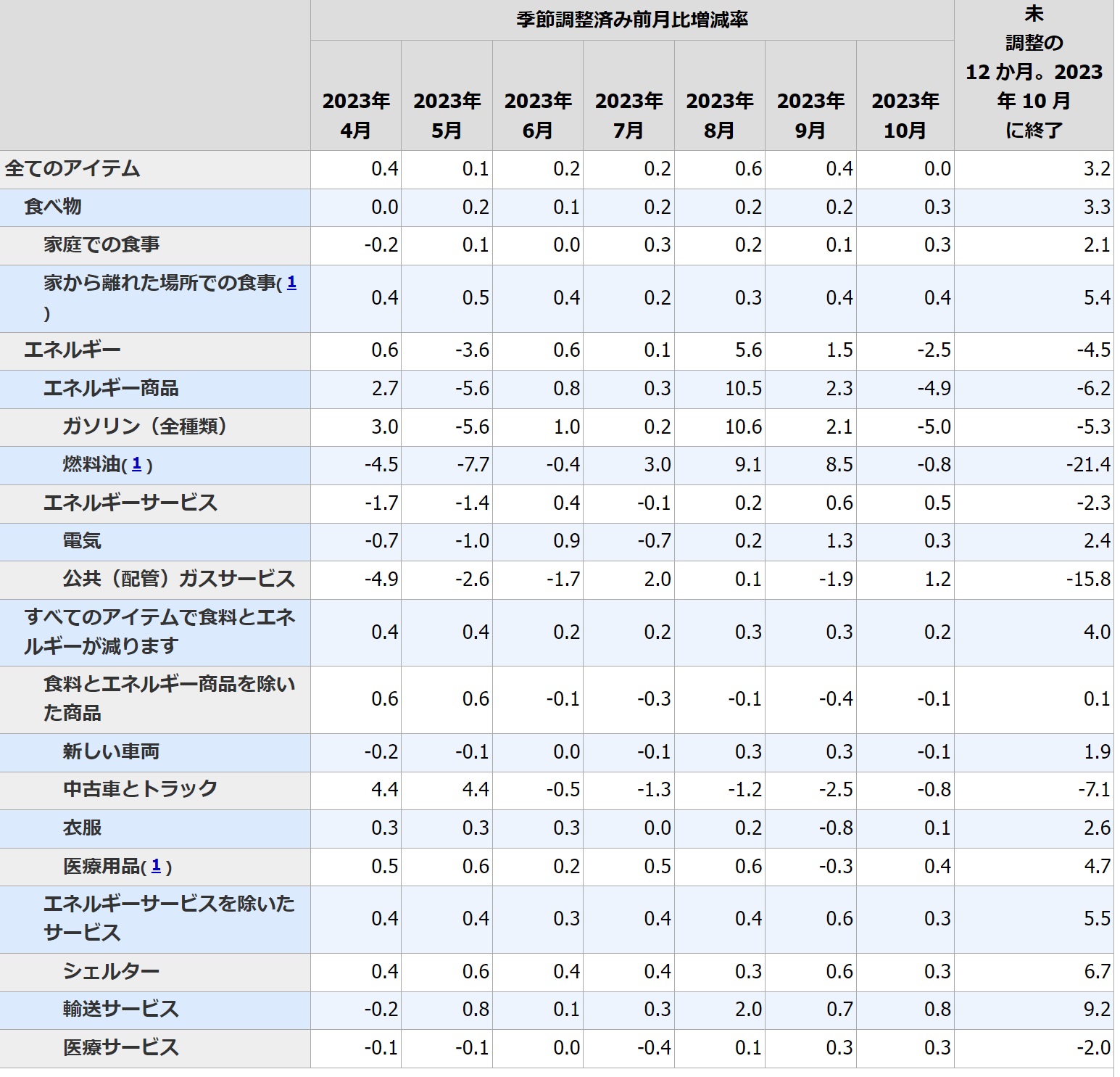 先週の市場を動かしたのは、米国のマクロ統計だった。最初にCPIこと10月の米消費者物価指数は全般に鈍化し、利上げ打ち止め観測が高まった。変動の大きい食品とエネルギーを除くコア指数が前月比0.2%上昇にとどまったこと、ガソリン価格下落の影響で、総合CPIが前月比横ばいとなったことなどからだ。詳細は下表から読み取って欲しい。