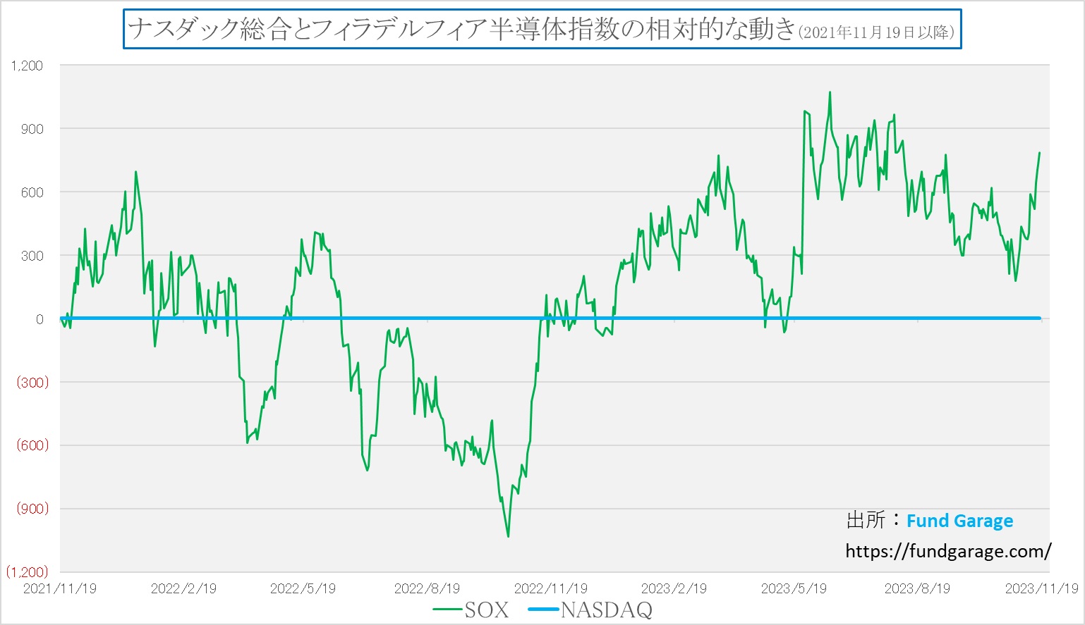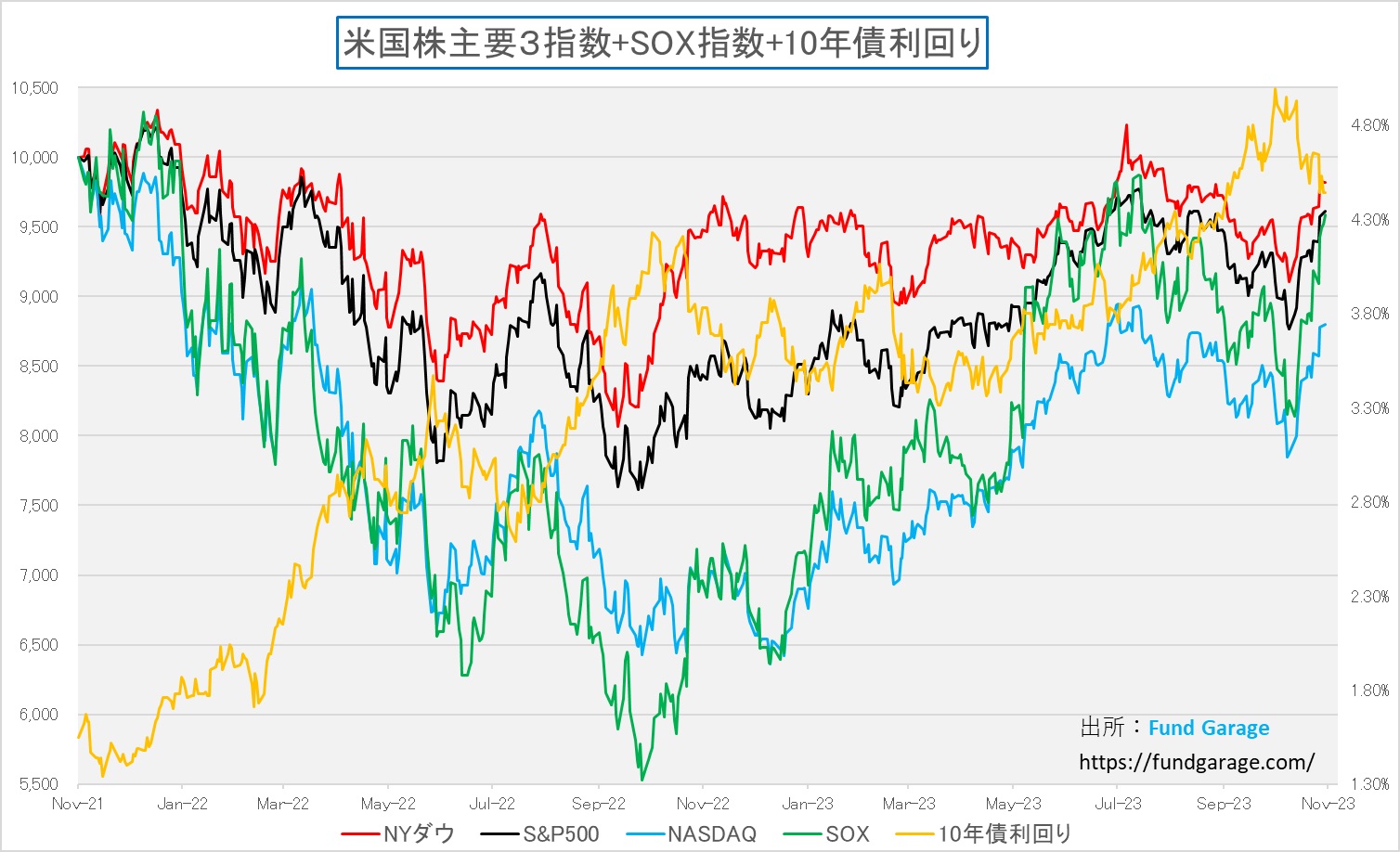 これを受けて、市場ではFRBの利上げ打ち止め観測から長期金利が低下、2年債利回りが5.03%から4.83%へ、10年債利回りが4.64%から4.44%にまで低下した。この日、金利低下を囃してフィラデルフィア半導体指数ことSOX指数は1日で+3.62%もの上昇を演じた。