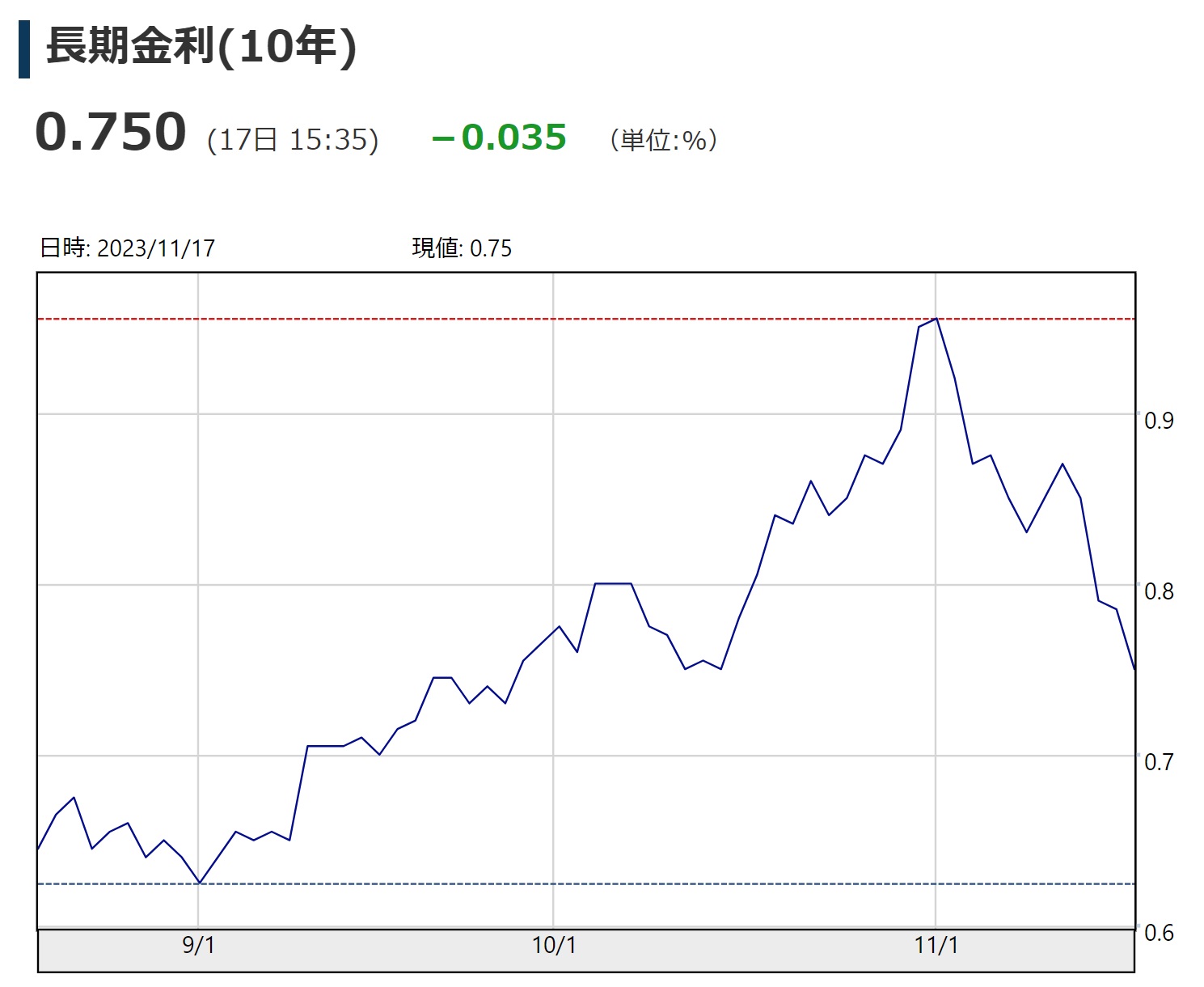 念のため、過去3カ月の日本の長期金利(10年債利回り)の推移をチャートで見ておこう。チャートで見ると、大きな変化があったように見えるが、絶対値で見ると、相変わらず「ごまめの歯ぎしり」程度の変動でしかなく、これについてあーだこーだと読み解く価値もどうかと思うが、一番高いところの11月1日の値は0.955%。つまり、0.195%も金利が低下したことになる。(説明していて、どこか虚しくなるのは気のせいだろうか?)。