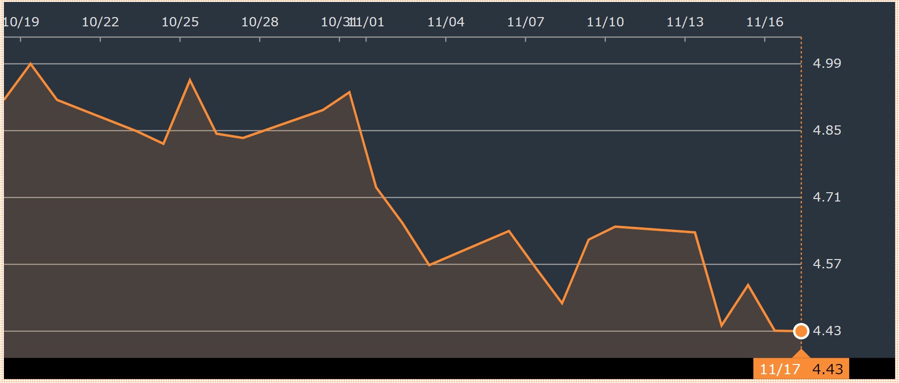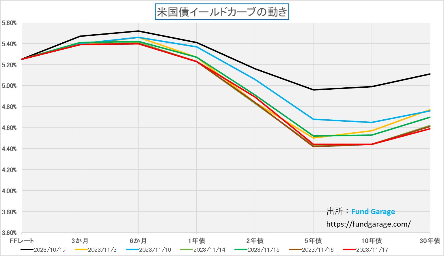 結果的に、市場はこれらのマクロ統計を好意的に受け入れた。つまり小売売上高は市場予想よりも強く(良い兆候)、物価上昇によるインフレ圧力は緩和(良い兆候)ということだ。結果的に下に示すように、イールド・カーブは大きく下方に移動して週末を迎えた。ひと月前の10月19日(黒線)には10年債利回りが5%前後になっていたことを考えると、様変わりしていると言える。但し、逆イールドが強くなったことは、決して褒められた話ではないことだけは注記しておきたい。一歩間違えれば、リセッション懸念が浮上するからだ。