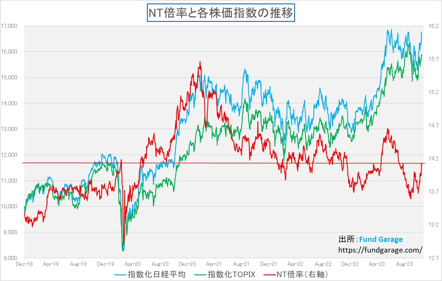 日本株式市場、一部の値がさハイテク株が買われていることで日経平均株価が吊り上げられているか否かを確認しておこう。それがNT倍率のチャートだ。実は幸いにもNT倍率が妙に割高になっているということは、現状は確認出来ない。逆に言えば、過去のNT倍率の水準で14.7倍程度は勢いが加速すれば有り得る水準であり、そこから逆算すると日経平均株価の35,000円台も見えてくるのは事実だ。ただその為には、何らかの「買う理由」が必要となる。個人的な感覚で言えば、「新NISA」投入が来年以降のマーケットに寄与するエネルギーは、そう大きくはならないと思っている。何故なら、若い世代(資産形成層)には日本の伝統的な企業よりも、アップル(AAPL)やマイクロソフト(MSFT)、或いはエヌビディア(NVDA)などの米国株の方が余程身近に感じられているからだ。