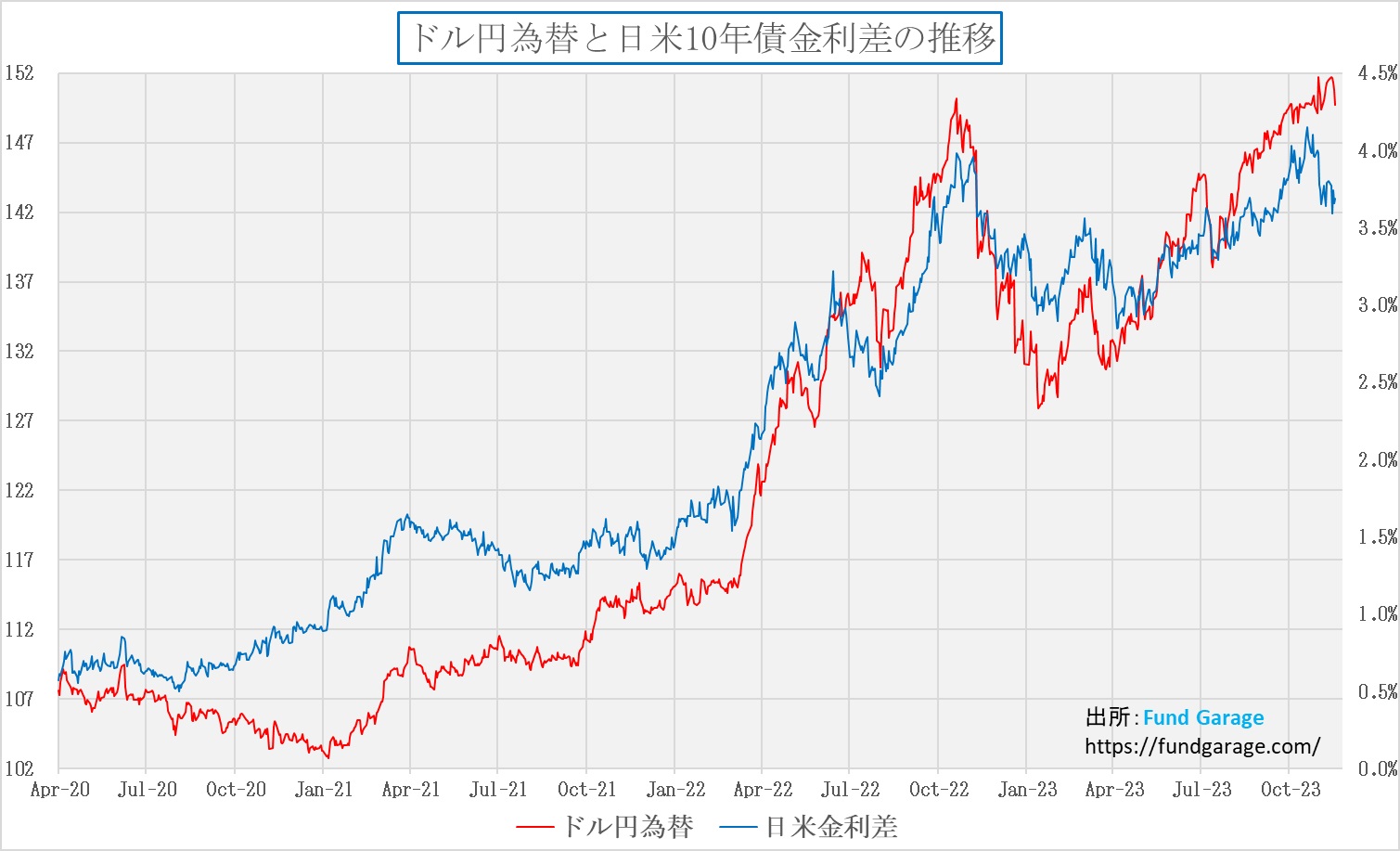 下のチャートを見て頂こう。ドル円相場は赤い線で描いてあるが、Y軸のトップは152円としてある。つまりギリギリまでは貼り付いたが、152円になることはなく、先週末は149.72円で一週間を終えた。金利差と言う視点からだけで足許のドル円相場の動きを説明するには無理がある。何故なら、この金利差からならば少なくとも147円以上に円高に動いていないと、チャート上、見た目が悪過ぎるからだ。