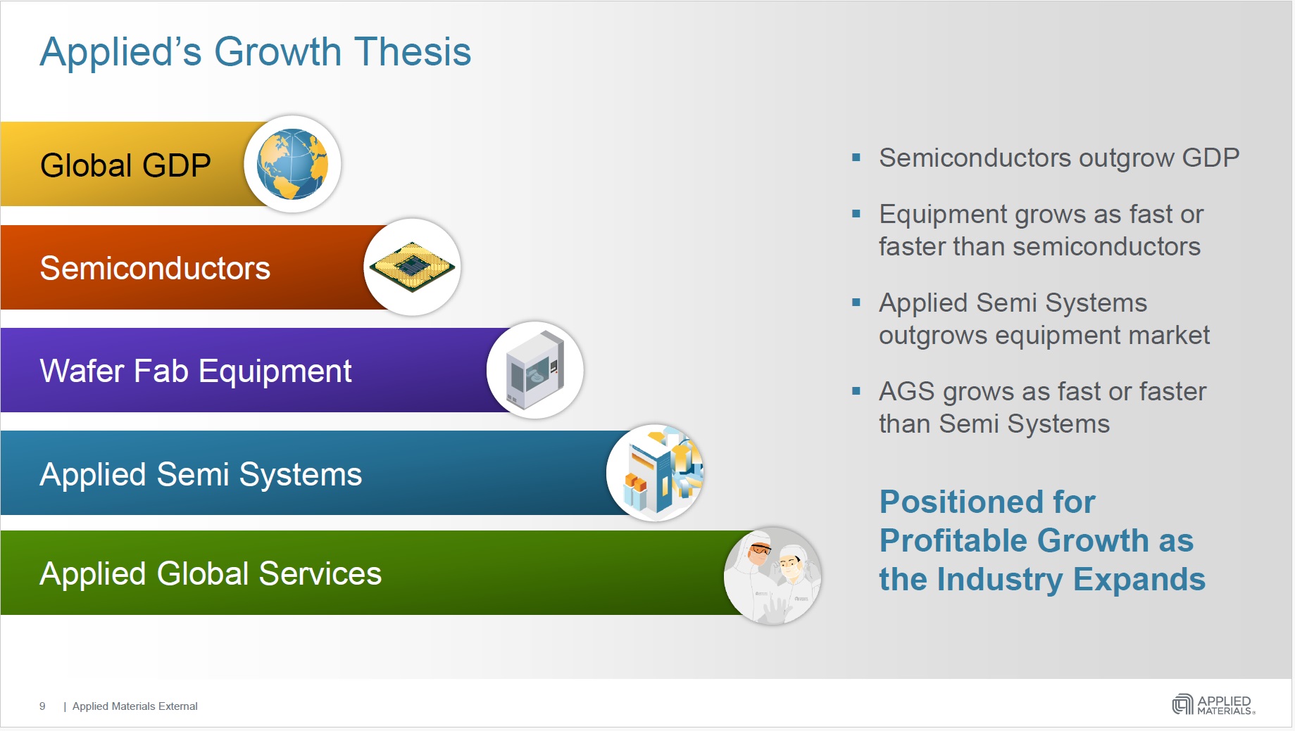 CEOは今後の見通しについて下記のスライドを使って「当社は長期的な成長の機会について引き続き前向きであり、半導体はGDPを上回る速度で成長し、ウェーハ製造装置は半導体と同等かそれ以上の速度で成長し、アプライドはウェーハ製造装置市場を上回るパフォーマンスを発揮し、当社のサービス事業も同様の速度で成長すると予想しています。または機器の販売よりも早くなります。(we remain positive about our long-term growth opportunities, where we expect semiconductors to grow faster than GDP, wafer fab equipment to grow as fast or faster than semiconductors, Applied to outperform the wafer fab equipment market and our Service business to grow as fast or faster than equipment sales.)」と大きなポイント5つを説明した。