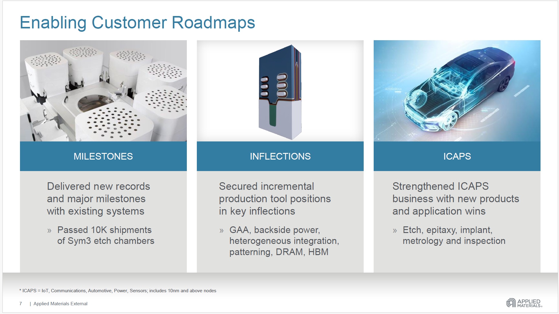 特に重要なのは、上記スライドの真ん中にある「INFLECTIONS」だ。専門的(マニアック、或いはオタク)過ぎてついて行けないと思われるかも知れないが、要は今現在、半導体製造は技術的に大きな変曲点にあり、半導体メーカーは投資を続けなければならず、その中心にアプライドマテリアルズがあり、その恩恵を最も享受出来るということだ。テクニカル・キーワードは、「Gate-All-Around」、「backside power」、「heterogeneous integration」、「patterning」、そして「HBM」といったところだろう。果たしてこの4つの単語の内、多少なりとも耳にされたことがあるだろうか。この業界、こうした耳慣れない単語が飛び交う時は、間違いなく「INFLECTION POINT(変曲点)」を迎えている時であり、投資が加速する。ただ注意を要するのは、市場は得てして「関係ないもの」まで誤解して飛びつくということ。やはりある程度は、ハイテク株投資をするならば、実際に触れてみるとか、調べてみることが必要だと思う。
