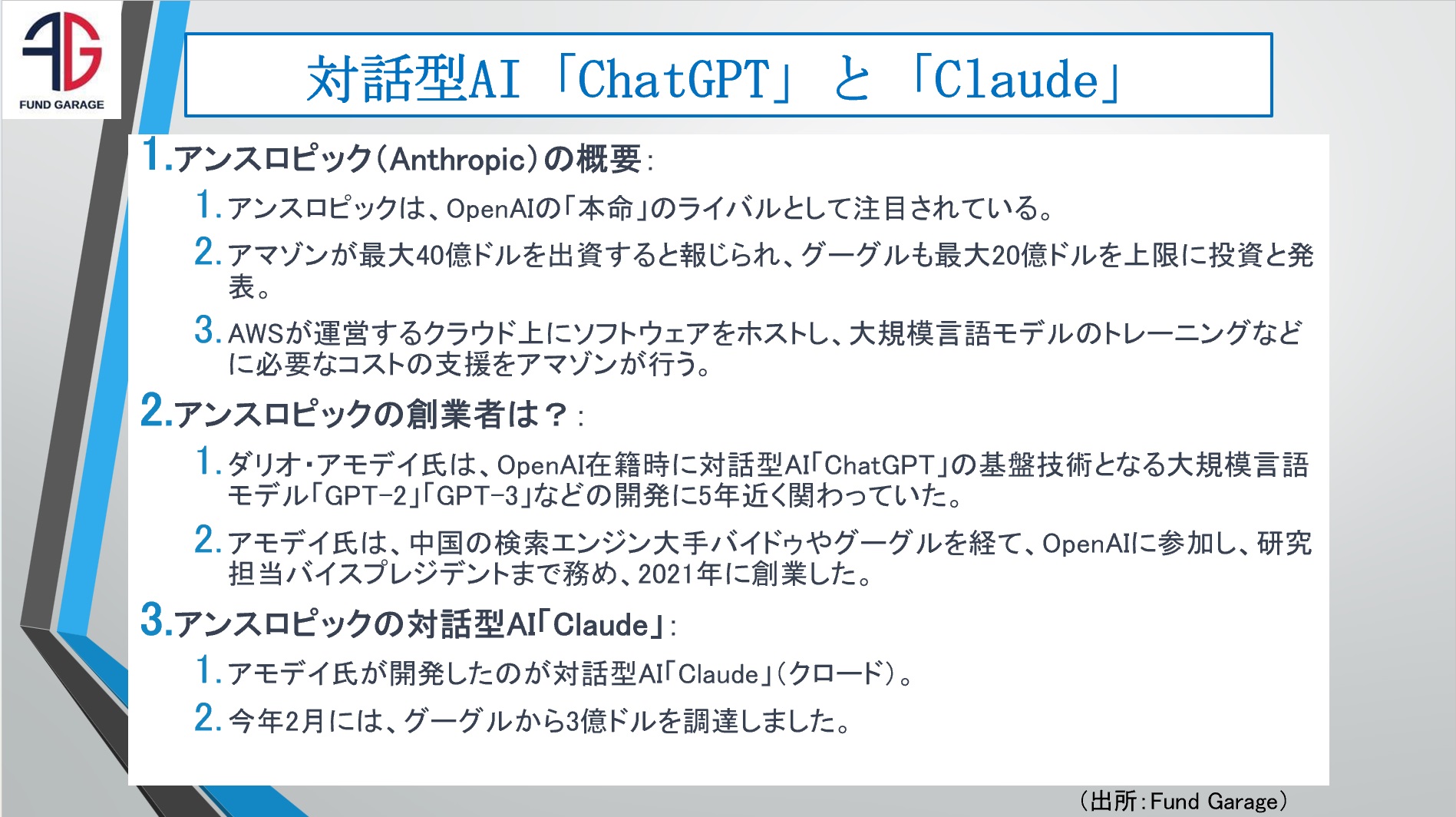 恐らく、大きな影響は出ないだろうと思われる。勿論、今この時点で断定することはリスクを伴うが、既にOpenAIは「ベンチャー企業」というフェーズではなくなっている。アルトマン氏については色々な伝聞もあるようだが、OpenAIで「ChatGPT」の基盤技術となる大規模言語モデル「GPT-2」「GPT-3」などの開発に5年近く関わっていた(現在は「GPT-4 Turbo」)ダリオ・アモディ氏(現在、人工知能(AI)スタートアップ企業兼公益法人アンスロピック(Anthropic)の創業者)と袂を分かつことになった辺りから、状況は変わったのかも知れない。また、OpenAIは既にマイクロソフト(MSFT)がその49%の株式をもつ会社であり、ある意味では、そのガバナンスの対象でもあるからだ。