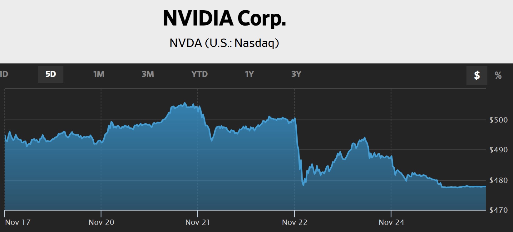 エヌビディアの決算内容等については後述するが、実績、ガイダンス共に市場コンセンサスを上回る見事なものだった。だが、大変不思議なことに、時間外取引から早くも下落が始まり、翌日の本市場取引でも下のチャートが示すように、500ドルから480ドル割れまでストンと売り込まれた。そして更に週末金曜日も売られ、一週間の高安は上が504.09ドル、下値が週末の477.76ドルとなった。正直ありきたりな「対中国向け貿易規制」の不透明さという「それらしい」理由以外は、「Thanksgivingでまともな機関投資家が市場に居なかったから」というような野暮ったい理由しか思いつくことは出来なかった。だが少なくとも前者については決算説明会の中でも質問があったが、余程心配性な投資家でもない限りは、株価を左右する材料とは受け止めなかっただろう。
