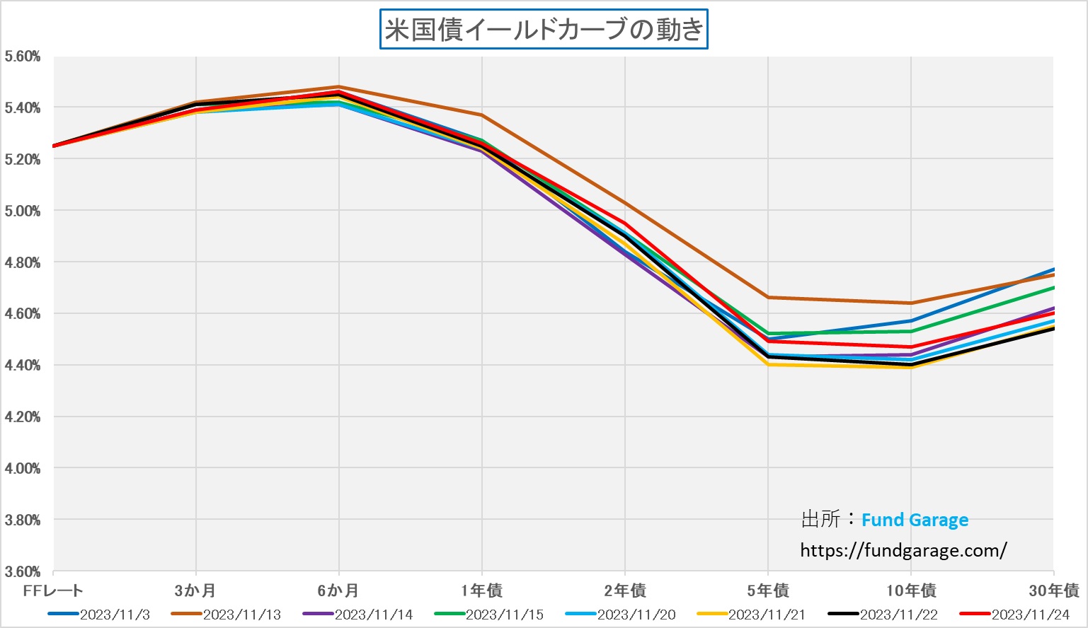 そもそも米国債券市場は先週3日間と半場しか取引はしていない。Thanksgiving当日の23日は全日、そして翌24日金曜日も後場は休場となっているからだ。そんな中で、下記で観察できる通り、イールド・カーブの10年債下限は4.40%まで低下した。これすなわち「債券が買われた」ことに他ならない。まず一番上にあるイールド・カーブは11月13日のもの。つまり10月小売統計が発表され、米景気が堅調であるとする材料が発表になった時だ。そして多くのイールド・カーブの真ん中に位置する紺色のラインがFOMCの直後のそれだ。Thanksgivingの前後の金利はFOMC後の時よりも低い水準で終わっているのが先週の特徴だろう。
