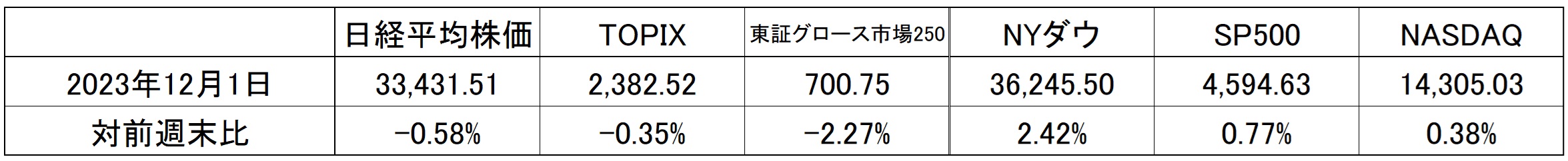 先週の各市場の動きは下記の通り。NYダウが2022年1月以来、約1年10カ月ぶりの高値になるなど気を吐いている。背景には①FRBが基調的なインフレを示す指標として重視する個人消費支出(PCE)価格指数は前年比3.5%上昇となったが伸びは市場予想と一致したこと、また②ISM製造業総合景況指数も13カ月連続で縮小し、リセッション(景気後退)を誘発したITバブル崩壊後以来の縮小圏停滞となったこと、そして③FRBパウエル議長が講演で「われわれの引き締めの効果はまだ十分に現れていない。インフレに対するわれわれの強力な対応は、FRBの信頼性を維持し、将来のインフレ期待を安定的に保った。これほど速くここまで来たのだから、引き締めの過不足リスクが均衡している状況下で、FOMCは慎重に前進する」と語ったことなどにより、利上げ終了観測及び利下げ期待が高まったことが挙げられる。