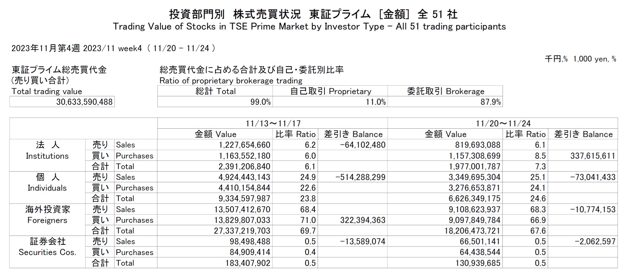 下の表は先週木曜日に日本取引所グループが発表した直近の「投資部門別 株式売買状況 東証プライム全51社」の動向だ。集計期間を見て貰えば明らかな通り、前週の「Thanksgiving」の一週間と、その直前の一週間の数値が比較されている。すると非常に残念なことながら、米国では日本のお盆休みの様な意味合いの「Thanksgiving」の1週間、海外投資家の売買ボリュームが減るのは当然として、その減少率と同じように日本の個人投資家の商いも細っているのがわかる。何故なら、11/13~11/17の週の海外投資家のシェアは「売り買い合計」の比率でみると11/20~11/24も、殆ど変わっていないからだ。すなわち、日本の個人投資家も「Thanksgiving」の一週間は同じように休んだという単純な算数だからだ。実数で言うと、海外投資家の売買総量が27兆3,000億円から18兆2,000億円とちょうど2/3に減少しているのと同じく、日本の個人投資家のそれが9兆3,000億円から6兆6,000億円に減少している。言うまでもなく、11月第4週に日本の投資家が市場を離れる理由は日本国内には存在しない。実際、ハロウィーンは日本に商業的に定着したが、Thanksgivingだからと言って11月第4木曜日に家族で集まって七面鳥を食べる習慣は日本では全く見られない。ただBlackFridayと、Cyber Modayという商業的イベントのみが輸入されている。