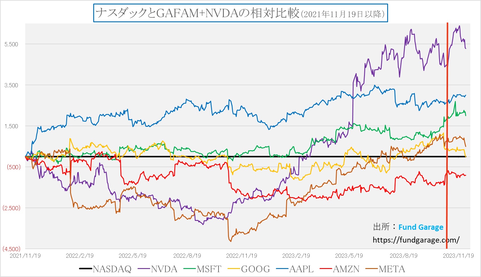 11月のNASDAQの動きに、どれほどGAFAM+NVDAが貢献したかを目視するために、こんなチャートを作ってみた。垂直に赤線を引いたところが11月1日のところ。実は、アマゾンドットコム、メタプラットフォームズ、アルファベットはNASDAQを月間でアンダーパフォームして足を引っ張り、アップルとマイクロソフトがそこそこ多少アウトパフォーム、そしてエヌビディアがアウトパフォームということになるが、11月に限って言えば「GAFAM+NVIDIA」への一極集中という一般的な市場解説が的を得る状況では無かったということ。