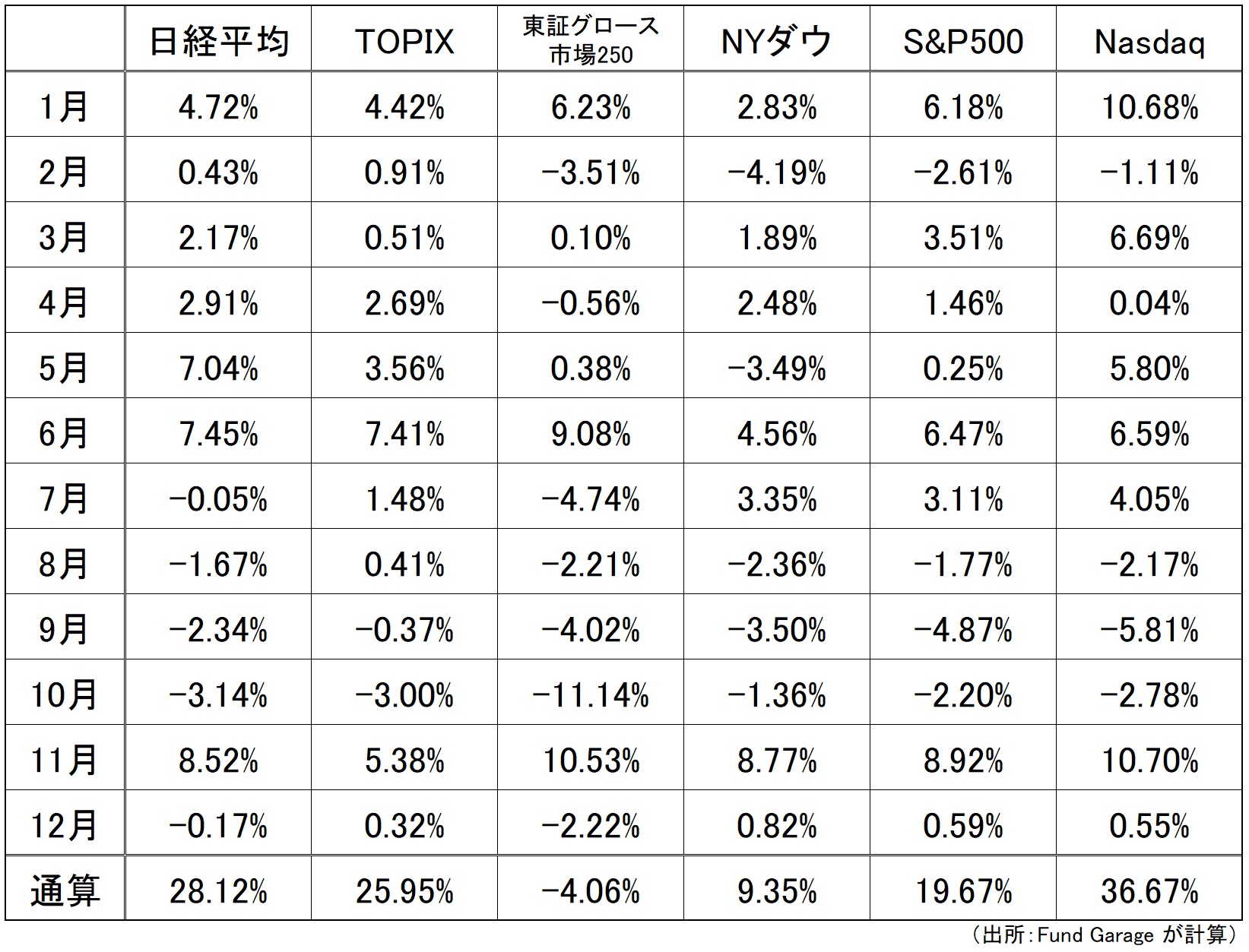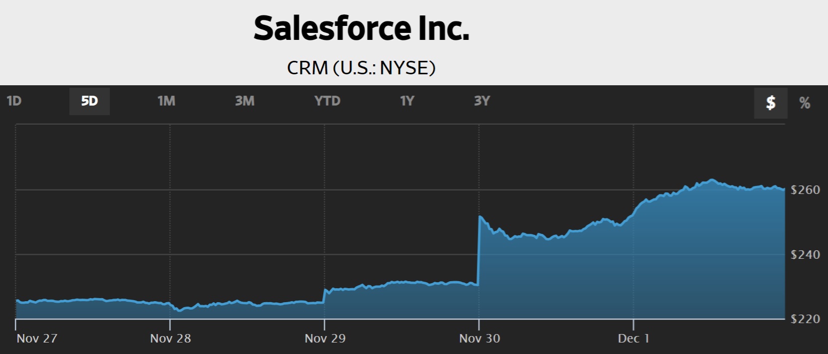ちょうど11月が終わったので、月末までの月次騰落率も確認しておこう。さて、下記の表をご覧になって、どんな感想を抱かれるだろうか。結果的にはNASDAQ市場が年初来ではダントツの好パフォーマンスを叩き出している。年初来で約37%というのは相当なものだ(証券会社なら「史上何番目の上昇率」といったデータを好んで使う場面)。その一方で、NYダウが年初来でその1/4程度しか上昇していないことは注目に値する。勿論、一時の下落率が大したことないからだという言い方も出来るかも知れないが、30銘柄という指数の歪さが際立ったのかも知れない。S&P500の上昇率がNASDAQの約半分と言うのも、NASDAQと同じ時価総額加重平均の株価指数でありながら、採用銘柄の違いでこうもパフォーマンスが違ってくるということの証左だろう。因みに、前述のSalesforce(CRM)はS&P500の構成銘柄ではある。